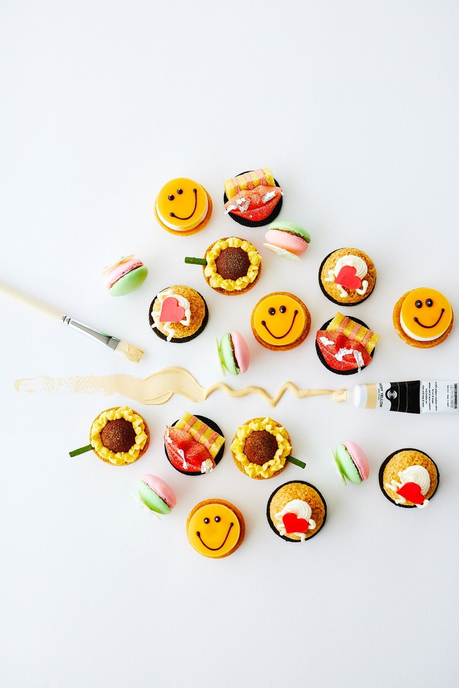 「Passion Fruit Smiles(パッションフルーツスマイリー)」は、そのルックスはもちろん、味わいにも笑顔がこぼれる、とびきりご機嫌なスマイリー。タルト生地の中に、パッションフルーツベイクドカスタード(卵黄、ミルク、パッションフルーツピューレ、メレンゲを混ぜて型に入れて焼いたもの)を詰め込みました。その横に鎮座するチョコレートのスマイリーの中にも、パッションフルーツ味のジェリーがしのんでいます。