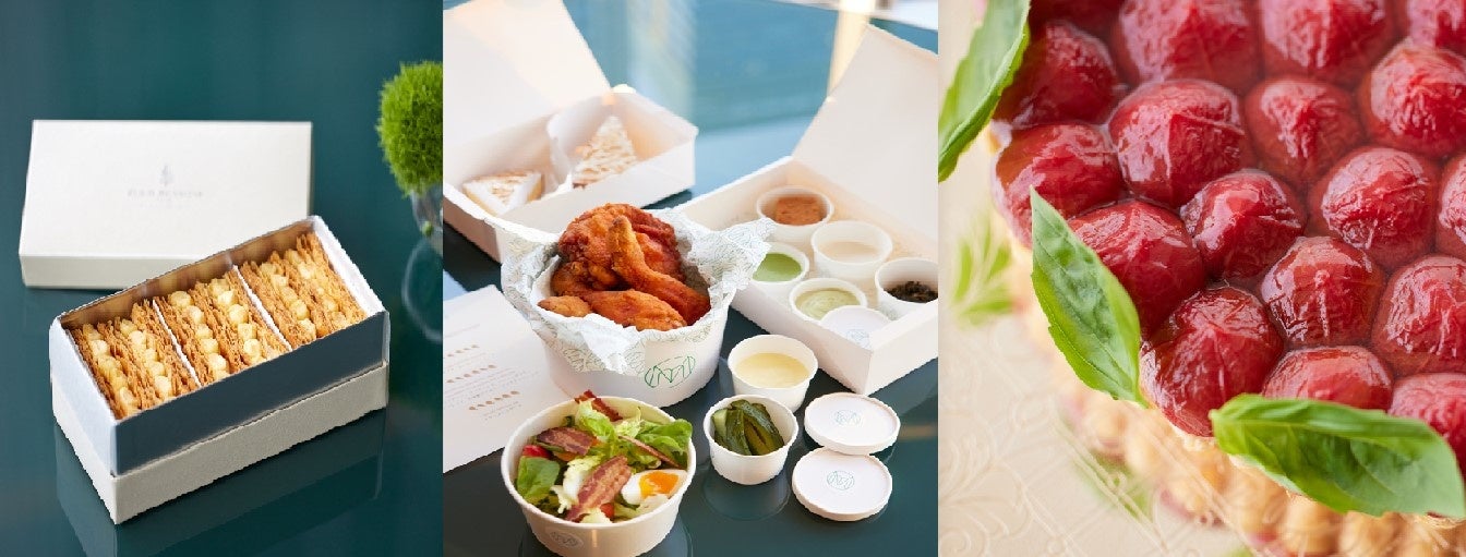 フォーシーズンズホテル丸の内 東京では季節のお手土産としてはもちろんのこと、ご自身へのご褒美やティータイムにもぴったりなテイクアウトアイテムを展開しております。MAISON MARUNOUCHIで人気「フライドチキンセット」やスイーツの「季節のミルフィーユ」、SÉZANNEの「トマトタルト ガーデンバジルとブラータチーズ」など心が躍るスイーツやセイボリーをご用意いたしました。