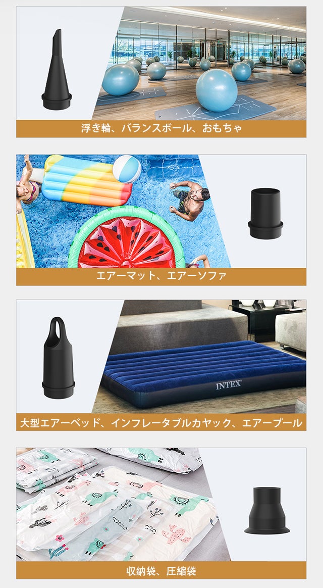 「AP8」の最大空気圧は驚きの4kPa、最大空気流量は250L/minで、90%以上の空気入れが必要なものに対応可能です。浮き輪やボールはもちろん、エアーベッドやエアープールなど大型のものでも素早く膨らませます。口で・手動式で膨らませるより衛生的で同行の家族や友人たちに作業完了まで長く待ってもらう必要も一切なし!