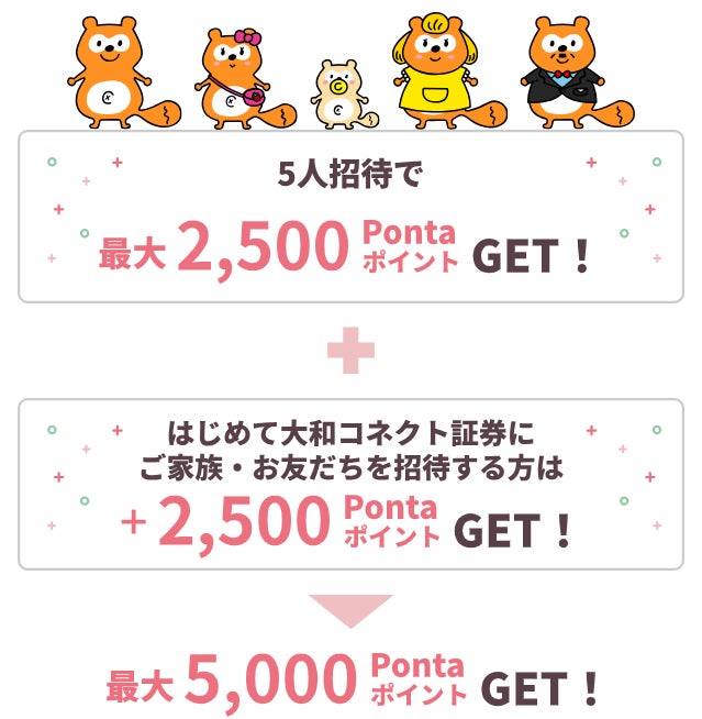 これから資産運用を検討されるご家族・お友だちを大和コネクト証券に招待していただき、その方に新規口座開設および初回ログイン※1をしていただくと、ご招待者さまに、1人招待するごとにPontaポイントを500ポイント、最大2,500Pontaポイント(5人招待)プレゼント!