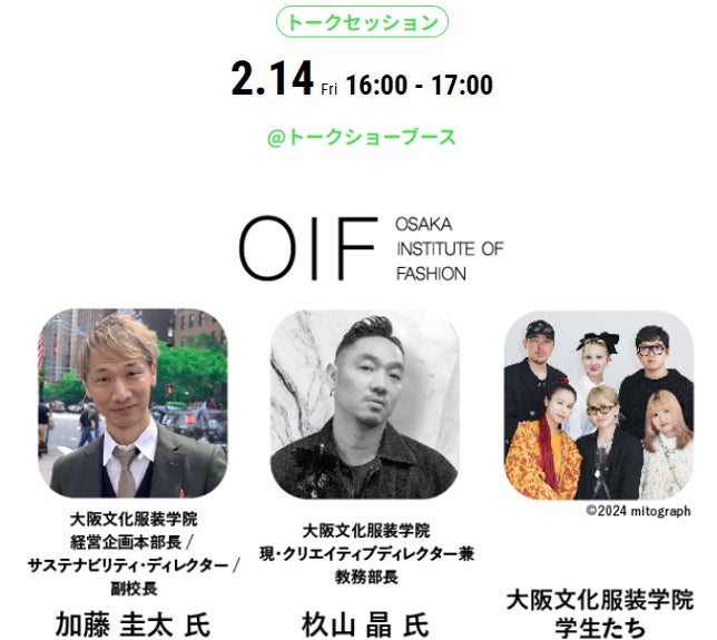 3日間を通して業界関係者、一般の方向けに「サステナブル」をテーマにした9コマのトークショーが予定されています。OIFは、2月14日(金) 16:00~17:00、「アパレル教育におけるサステナビリティのイマ」と題したトークセッションを実施。学生と教員がサステナブルファッションにおける教育の役割や課題について議論します。教育の現場での変化について学生側と教育者側の双方の視点から語り合います。