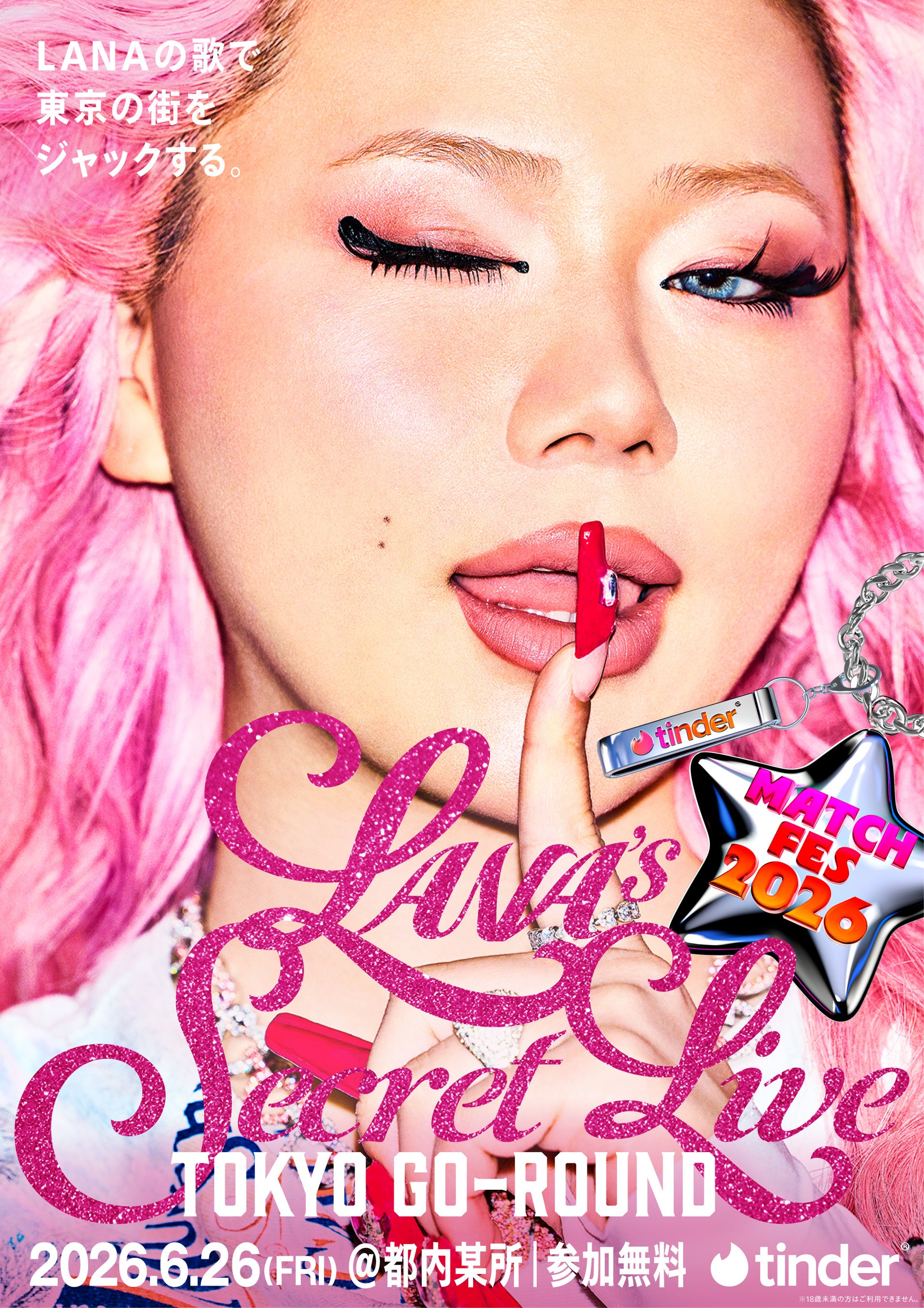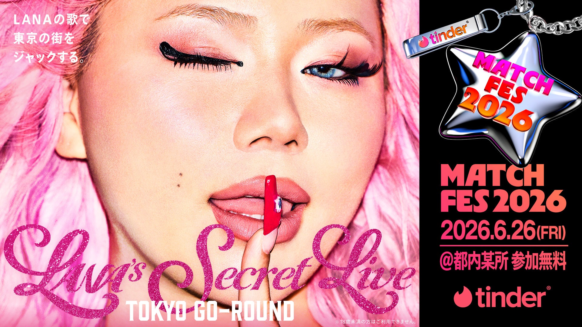 「Tinder」は、2026年6月に開催される、新たな出会いに踏み出すZ世代を応援するイベント「MATCH FES 2026」のメインスポンサーを務めることを発表しました。本イベントでは、Tinderのアカウントに登録することで、期間中に実施されるさまざまなコンテンツに参加することができます。その第一弾コンテンツとして、2026年6月26日(金)に、Z世代を代表するアーティスト、LANA(以下、敬称略)によるスペシャルライブ「LANA's Secret Live - TOKYO GO-ROUND - 」の開催を発表しました。