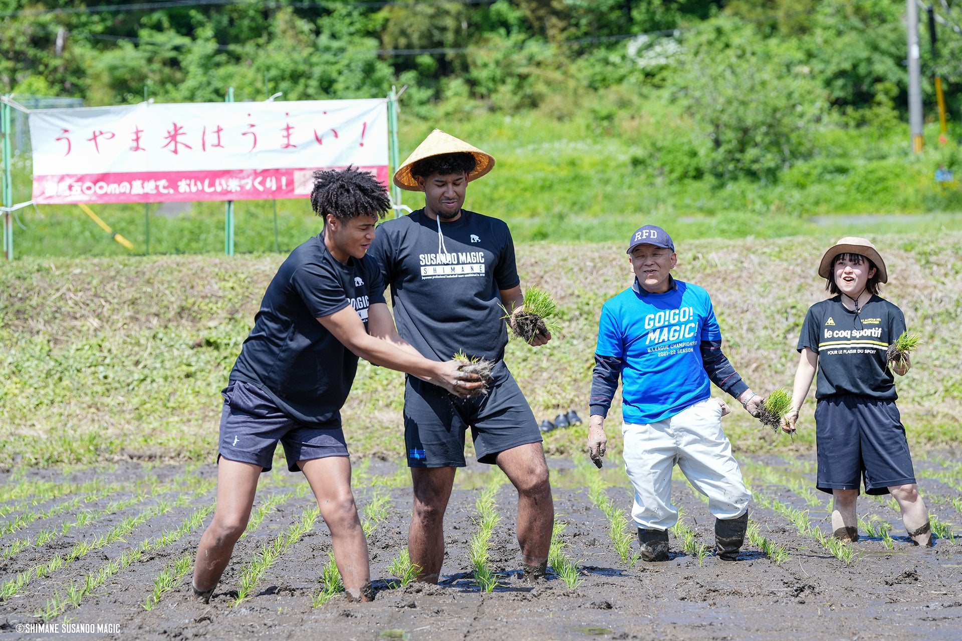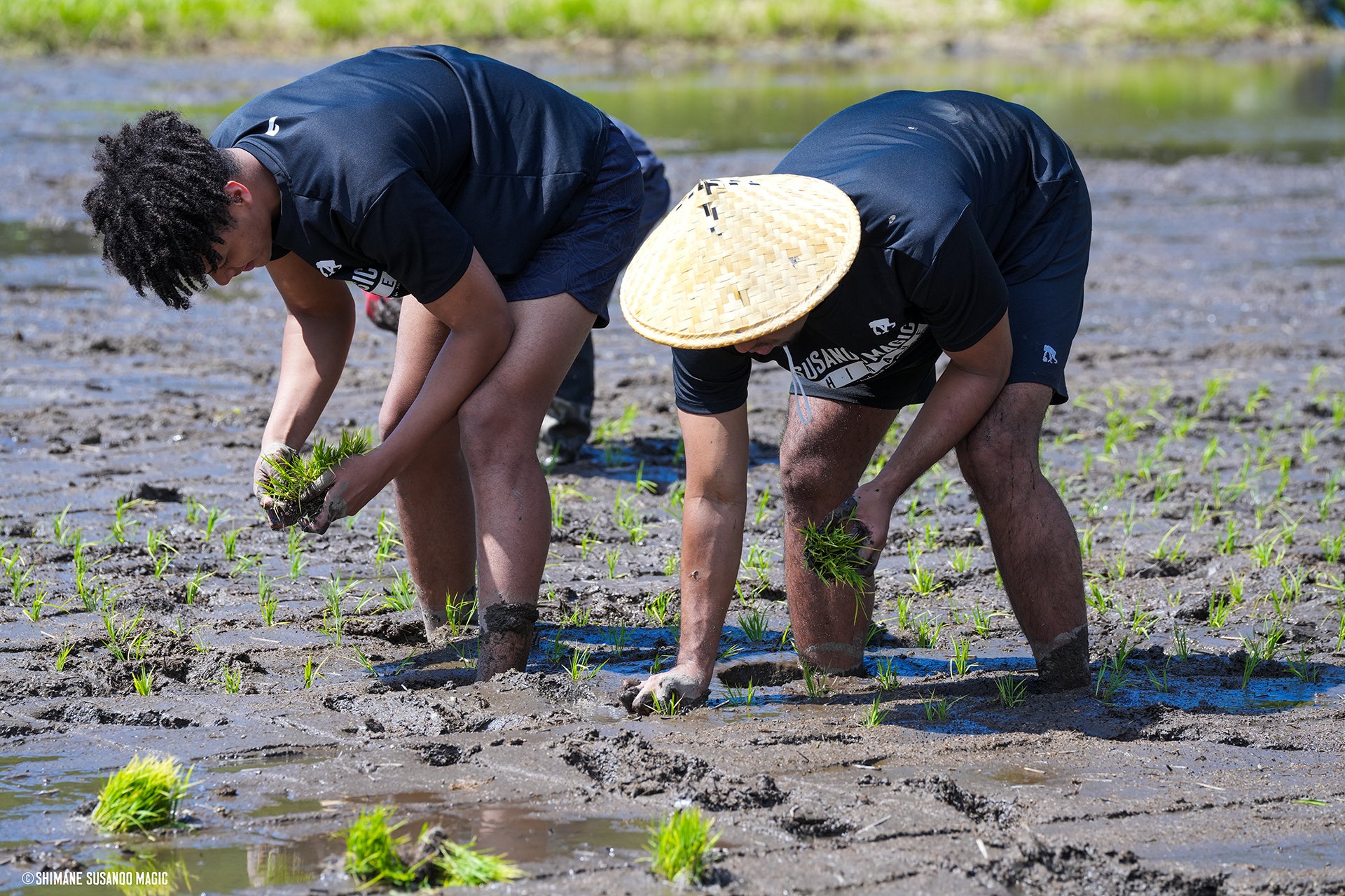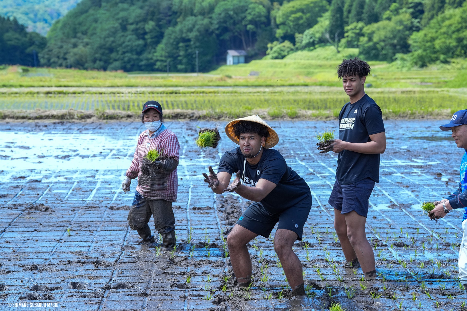【島根スサノオマジック活動報告】横地聖真 選手& 介川アンソニー翔 選手が島根の大地で田植えに挑戦