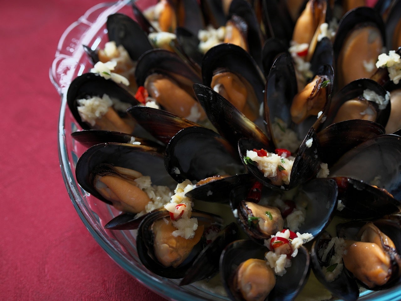 シュリンプカクテルサラダ, スモークカナールとキノコのマリネ, セビーチェ, クリスマスカラーのブルスケッタ, ムール貝のタパス, 彩り野菜のチーズフォンデュ