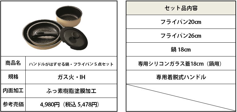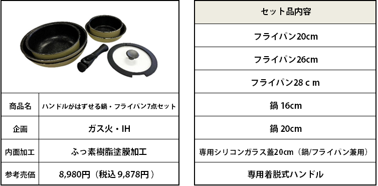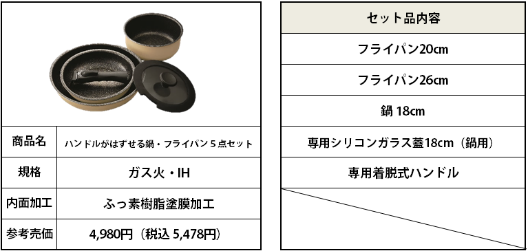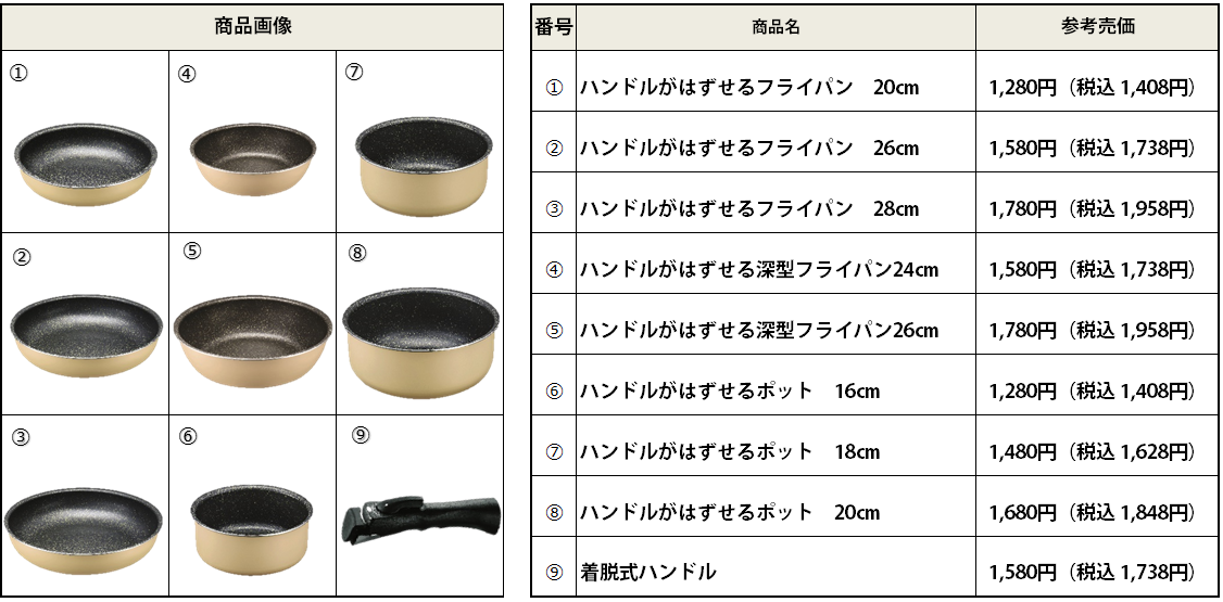 単品のみの販売は、フライパン5種類、ポット(鍋)3種類、着脱式ハンドルの合計9種類で展開します。全てのフライパンとポット(鍋)が、ガス火・IH対応です。