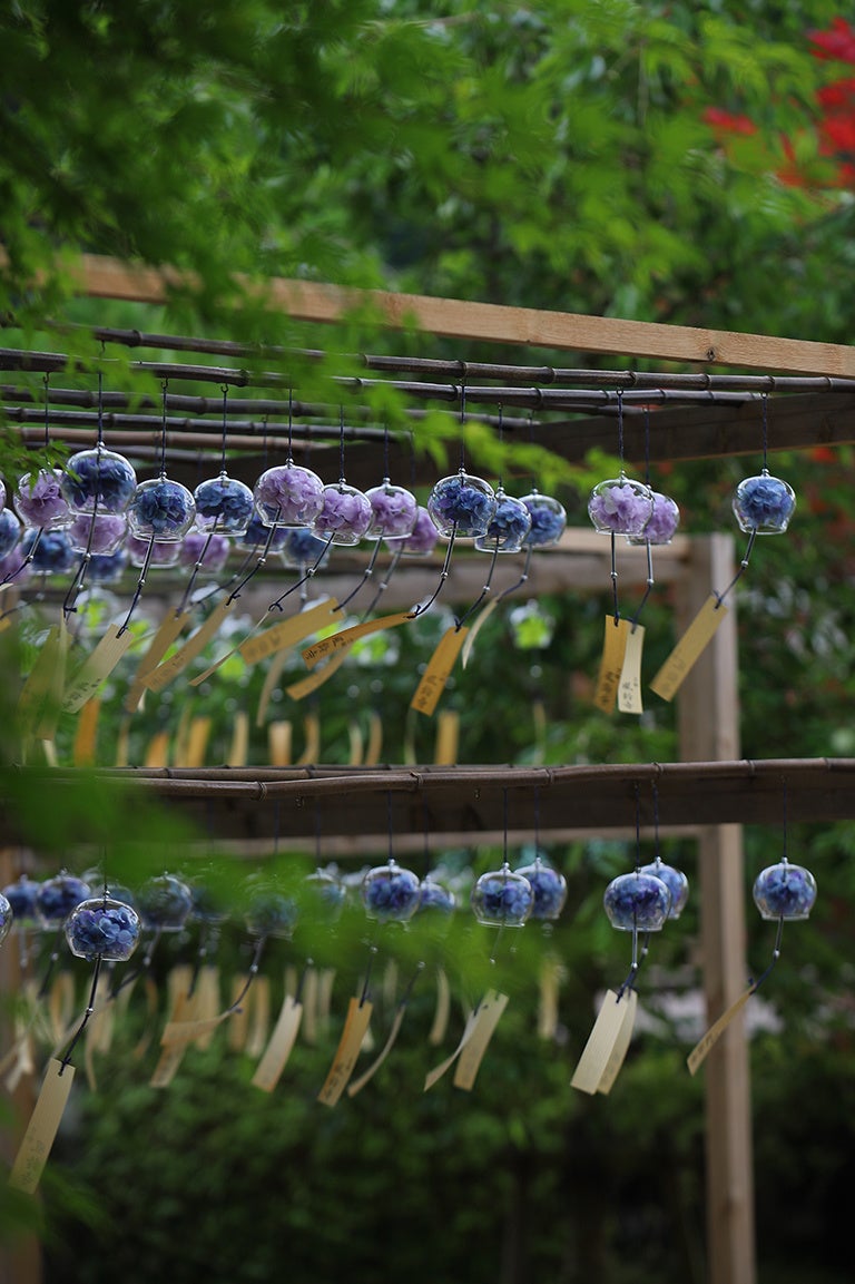 アジサイを望む猪目窓のスイーツテラリウムや夏蜜柑と煎茶のウェルカムドリンクで初夏を表現 縁起物の叶紐(かのうひも)・散華(さんげ)のお土産付