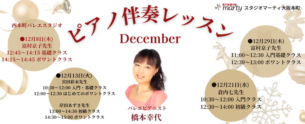 お馴染みのクリスマスソングから、現代のPOPソング、バレエの名作「くるみ割り人形」の中から数曲をピックアップし、いつもとは違うクリスマス限定の特別クラスをお届けします。