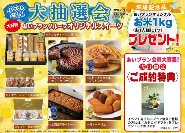 あいプラングループのオリジナルスイーツが当たるハズレ無しの大抽選会。北海道産の材料を使った「北海道バターケーキ」や「ガレットショコラキャラメルサンド」、様々な味を楽しめる「クッキー詰合せ」「ブリオッシュラスク詰合せ」などが当たります。1世帯につき1回ご参加いただけます。