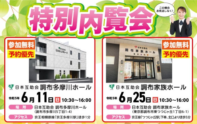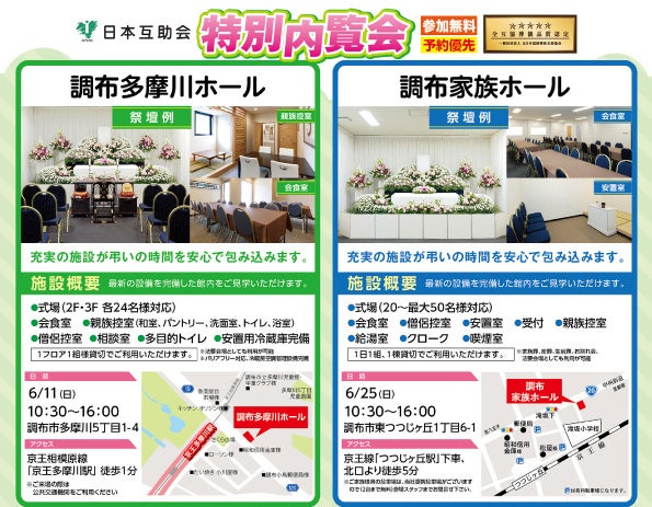 株式会社あいプラングループ(北海道札幌市/代表取締役・新道喜信)の調布多摩川ホール(東京都調布市多摩川5丁目1-4)と調布家族ホール(東京都調布市東つつじヶ丘1丁目6-1)で内覧会を開催いたします。終活をお考えの方や、ご家族のために準備をしておきたい方に向けて、葬儀のご説明や費用・ご希望・お悩みについてのご相談なども承ります。来場記念品や抽選会など楽しい企画もご用意しております。