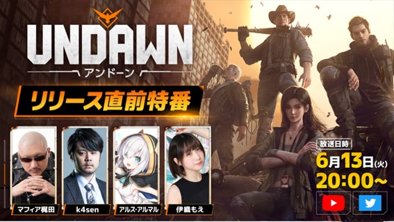 6⽉13⽇に、事前ダウンロードを記念した『Undawnリリース直前特番』が配信されました。MCにマフィア梶⽥さん、ゲストにVtuberのアルス・アルマルさん、コスプレイヤーの伊織もえさん、そしてストリーマーのk4senさんをお招きして、『Undawn』の魅⼒を紹介してくれました。ここでは、直前特番の内容をダイジェストでお送りします。