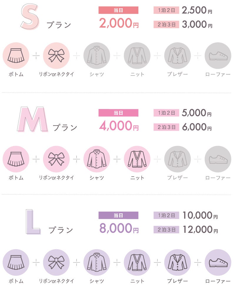 レンタルは当日~5泊6日の期間内で、ブレザー、ボトム、リボン、バッグ、ローファーなどのアイテムの中から単品やセットでご利用いただけます。プランの一例としてSプランは、リボンとスカートの2点で2,000円、Mプランは、スカート、シャツ、リボン、ニットの4点、4,000円で当日レンタルが可能です。