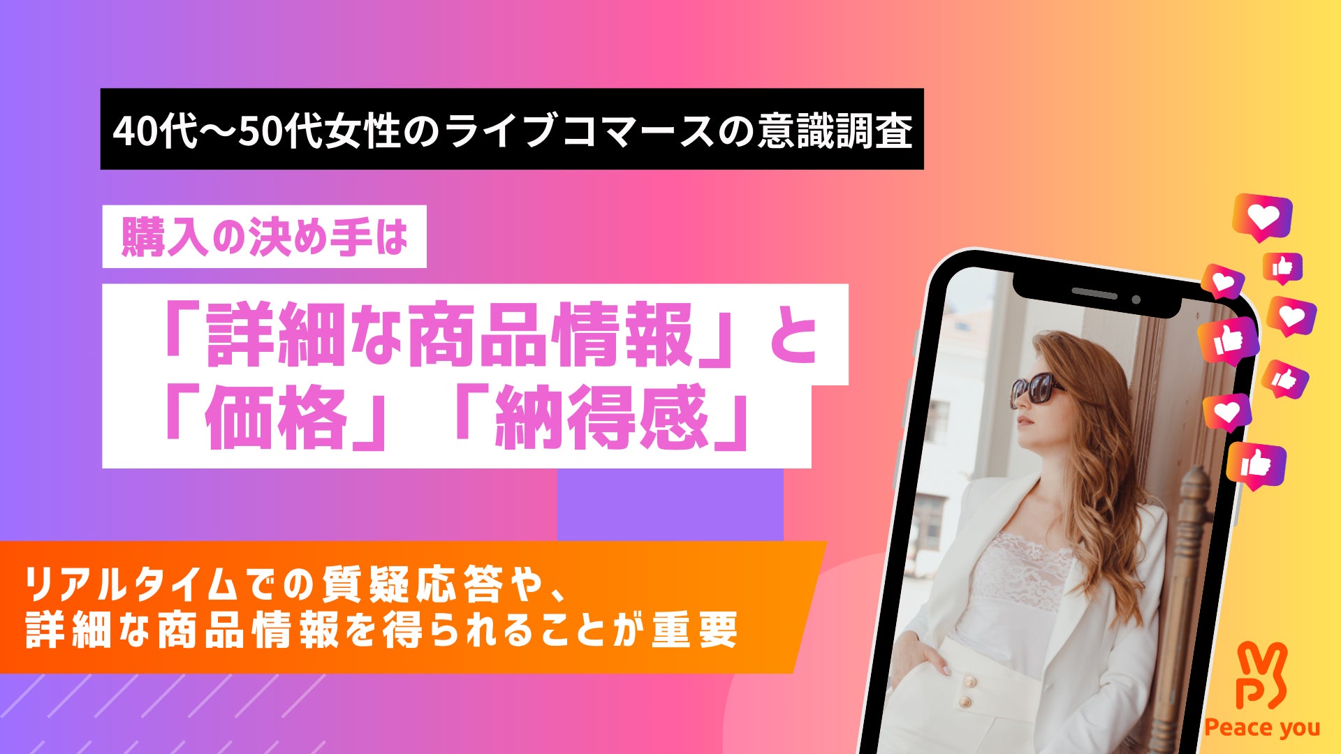 株式会社ピースユー(本社:東京都千代田区、代表取締役:藤瀬公耀)が運営する日本最大級のライブコマースアプリ「Peace you LIVE」(以下「ピースユーライブ」)は、40代~50代女性を対象に、ライブコマースにおける購買動機に関するアンケート調査を実施しました。