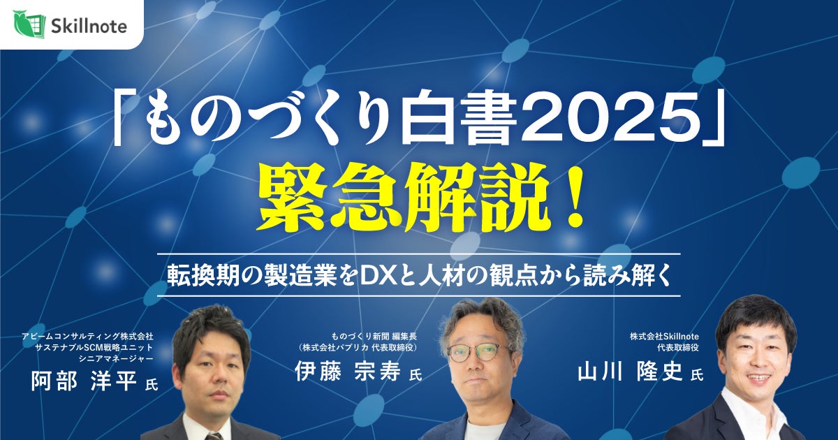 製造業の人材不足をスキルデータで解決する株式会社Skillnote(本社 東京都千代田区、代表取締役 山川隆史、以下 Skillnote)は、2025年7月16日(水)11時より、セミナー「『ものづくり白書2025』緊急解説!〜転換期の製造業をDXと人材の観点から読み解く〜」の開催をお知らせいたします。視聴は無料、事前申込み制です。