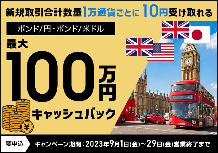 キャンペーンに申し込まれたお客さまに、期間中におけるポンド/円とポンド/米ドルの新規取引合計数量に応じて、最大1,000,000円をキャッシュバックします。
