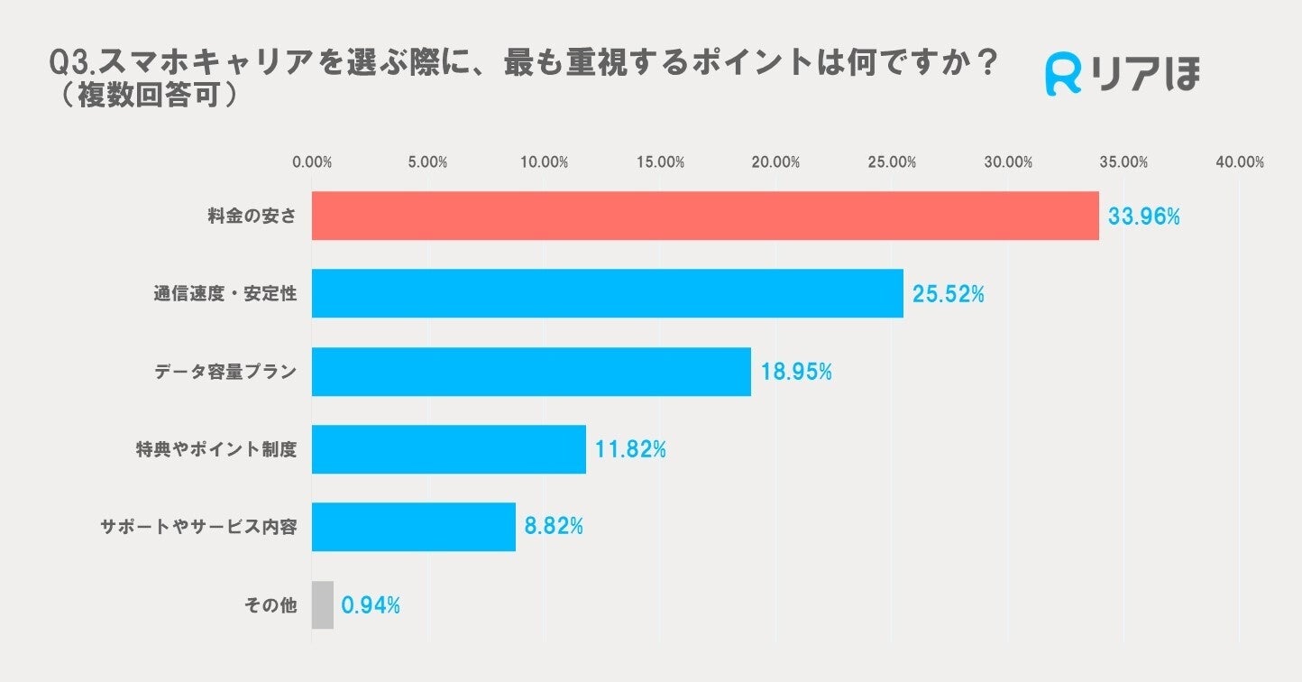 スマホキャリア選びで重視するポイントとしては、「料金の安さ」(33.96%)、「通信速度・安定性」(25.52%)、「データ容量プラン」(18.95%)となっており、料金の安さだけではなく価格と品質のバランスがキャリア選択のカギとなっていることがわかります。