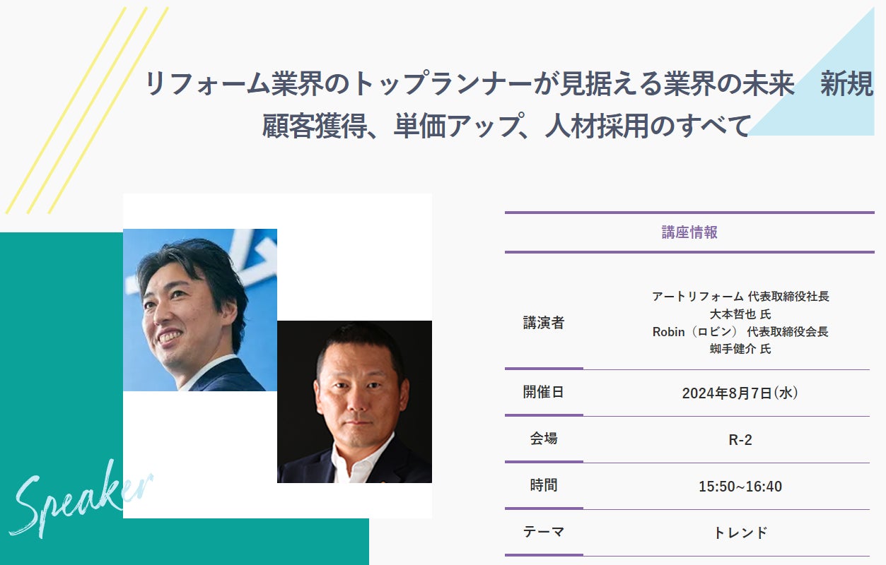 リフォーム産業新聞社が主催する「リフォーム産業フェア」にて、代表取締役大本哲也がセミナー「リフォーム業界のトップランナーが見据える業界の未来、新規顧客獲得、単価アップ、人材採用のすべて」に登壇します