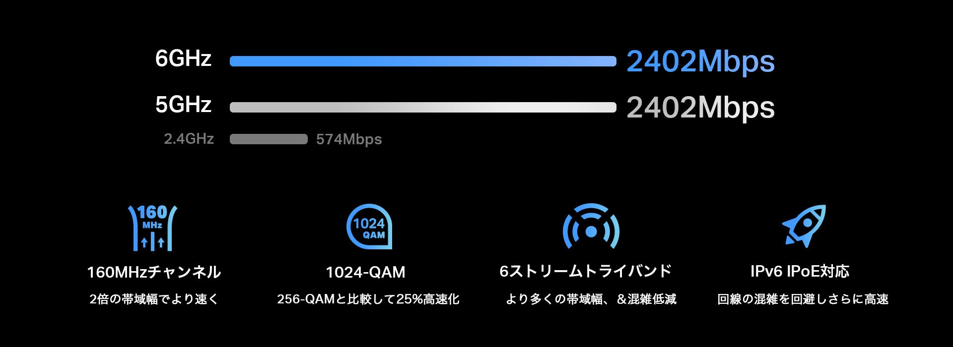 ・ Wi-Fiスピード*1:2402Mbps(6GHz,11ax, HE160)+ 2402Mbps(5GHz,11ax/ac/n/a, HE160)+ 574Mbps(2.4GHz,11ax/n/g/b)