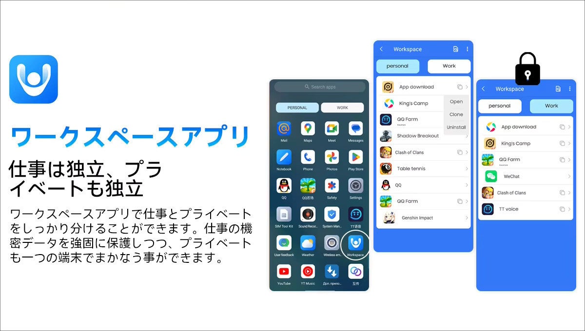 仕事とプライベートをしっかり分ける「ワークスペースアプリ」を使えば、アプリ一覧画面を仕事用とプライベート用で別々に表示でき、1つのアプリを異なるアカウントで運用することもできます。