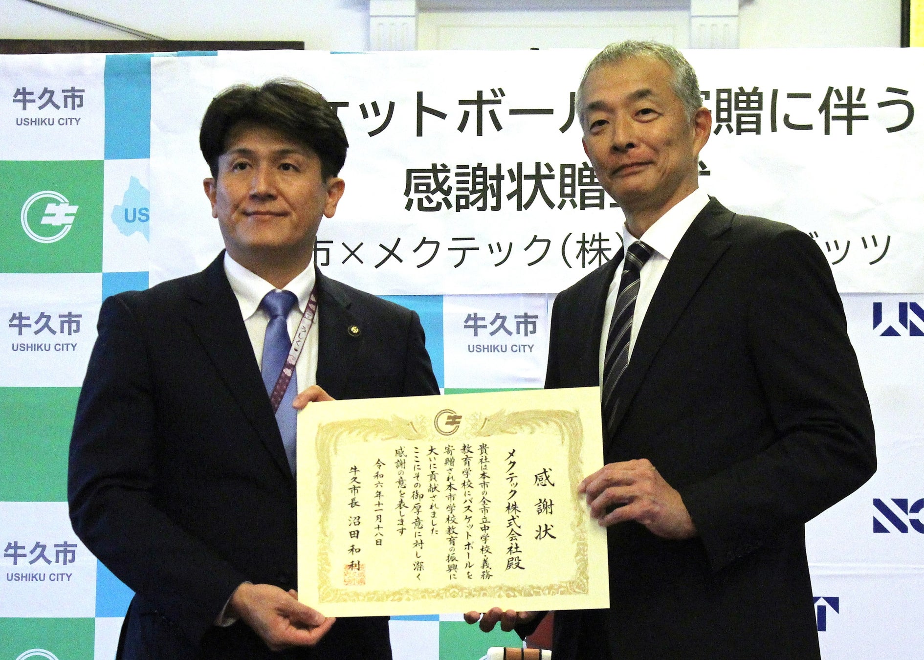 牛久市長 沼田氏からは、メクテックの本活動に対して感謝状をいただき、バスケットボールを通じたスポーツ振興や地域振興について期待の言葉をいただきました。