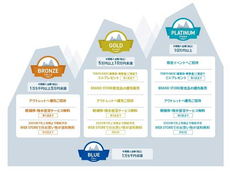 finetrack BRAND STORE(公式WEB STORE・finetrack 直営店)に会員登録いただいているお客様へ、ファイントラックのBRAND STORE(公式WEB STORE、finetrack 直営店)での年間購入額(税込)※1に応じて、ステージを付与します。ステージごとに、みなさまの遊びを応援する様々な特典がご利用いただけます。