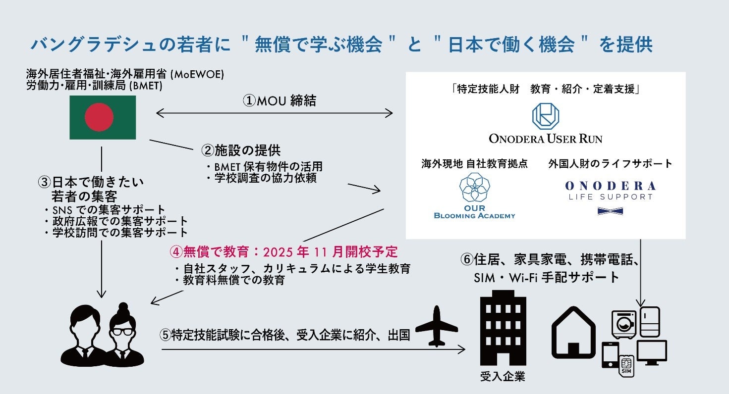 株式会社ONODERA USER RUN(代表取締役社長:加藤 順、所在地:東京都千代田区、以下「OUR」)は、2025年4月10日(木)、バングラデシュの政府機関「海外居住者福祉・海外雇用省(以下MoEWOE)」および「人材雇用・訓練局(以下BMET)」と、バングラデシュ国内における質の高い人材育成に向けた包括的な連携に関するMOUを締結しましたことをお知らせいたします。
