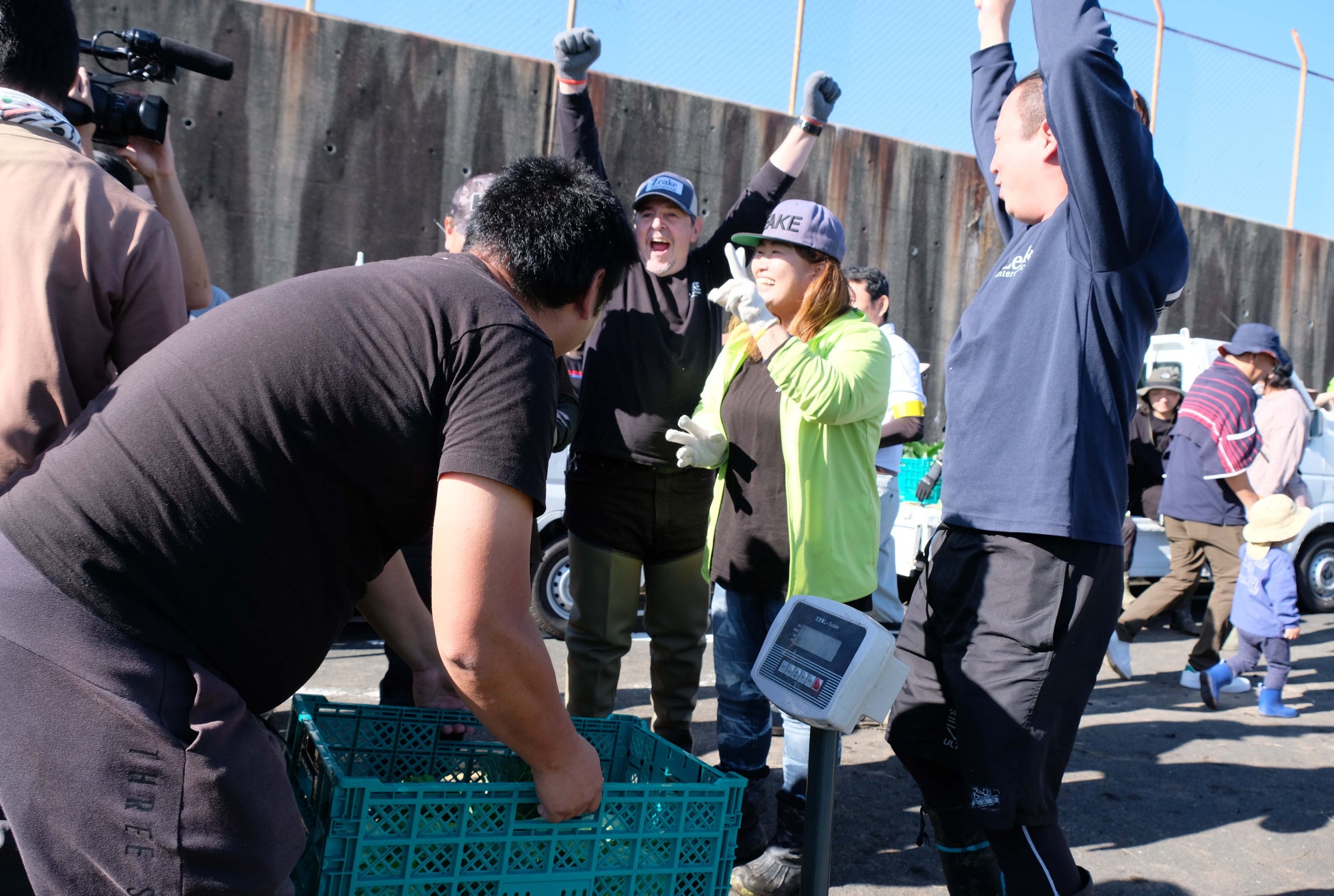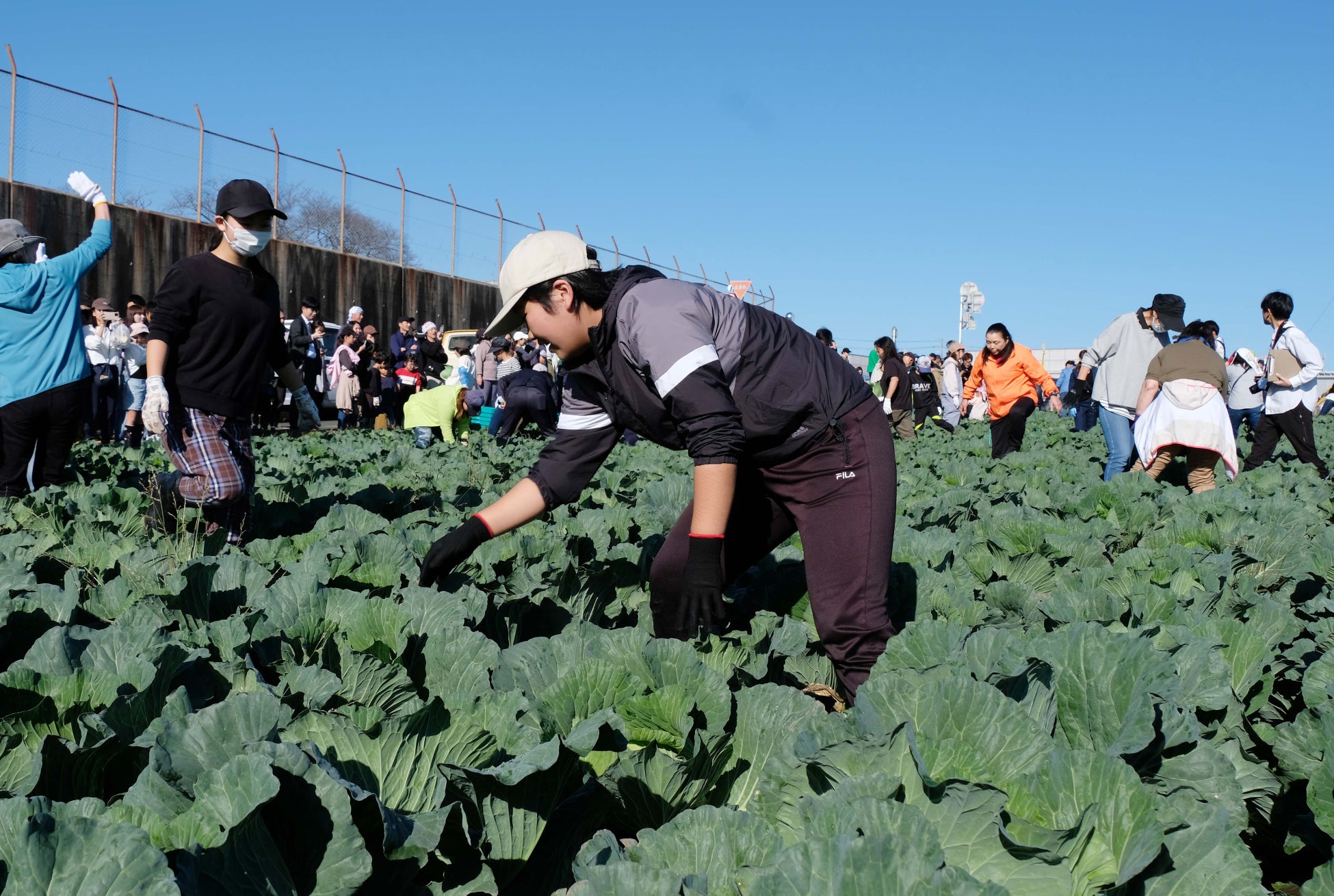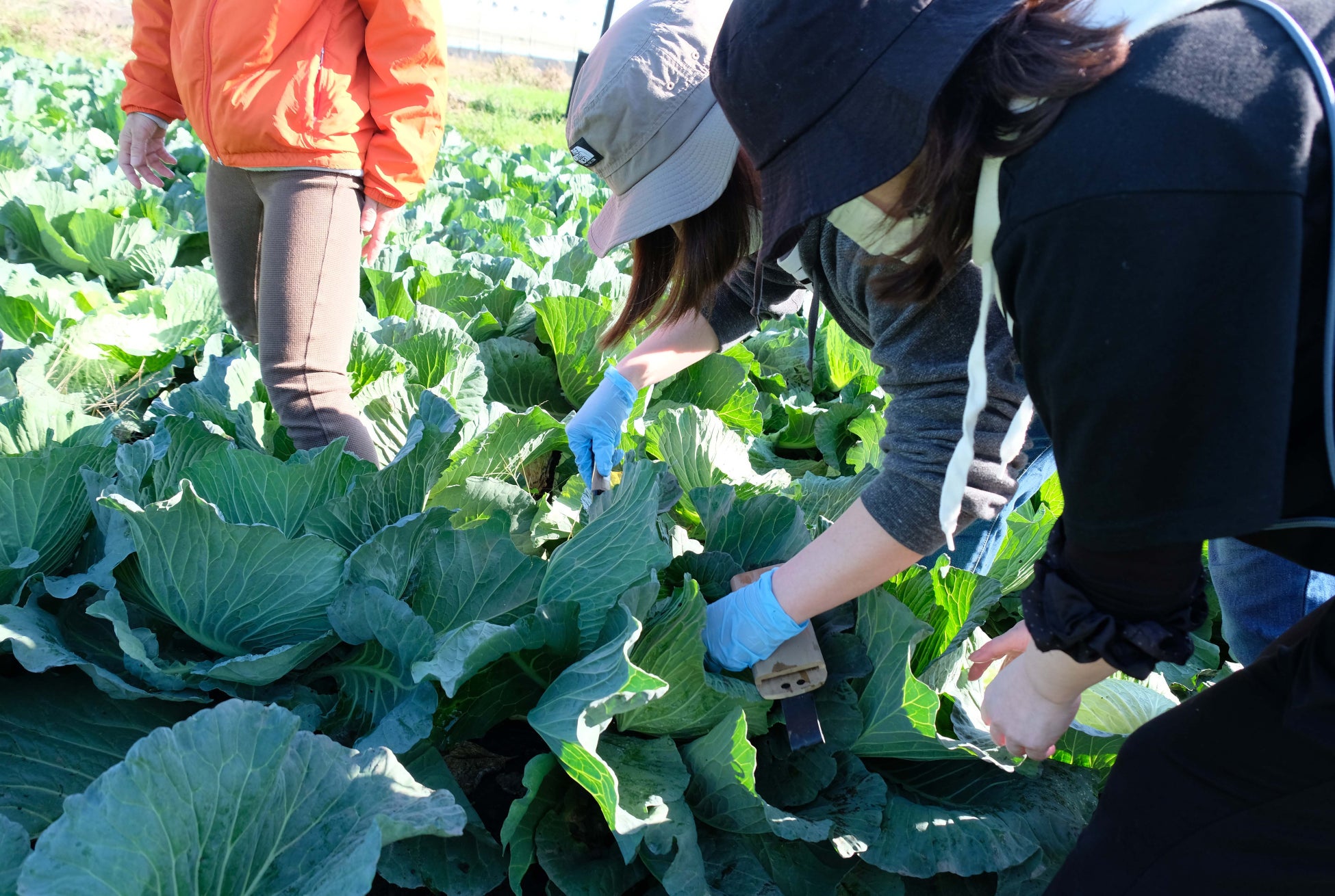 キャベツの収穫重量を、国民1人当たりのキャベツ年間消費量である5.9㎏にどれだけ近づけるかを競いました。参加者は大小さまざまなキャベツをよく見ながら重さを予想し、収穫しました。