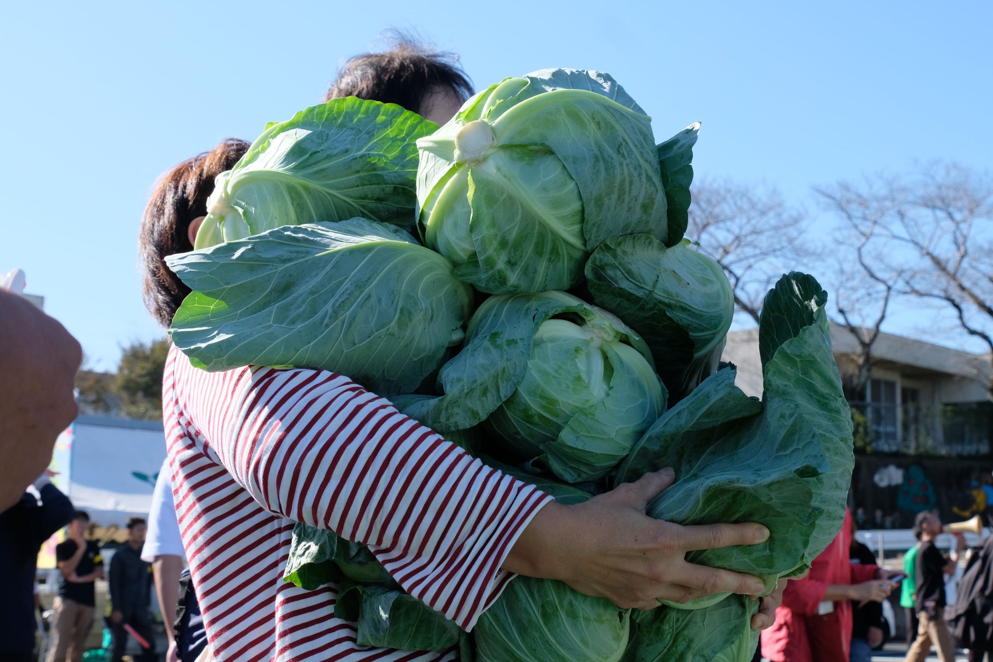 キャベツを2分間に1人でどれだけ抱えることができるかを競いました。参加者は1個でも多く積み上げることができるよう工夫しながら載せていきました。今回は28個のキャベツを抱えたチームが現れ、歴代最多記録を更新しました。