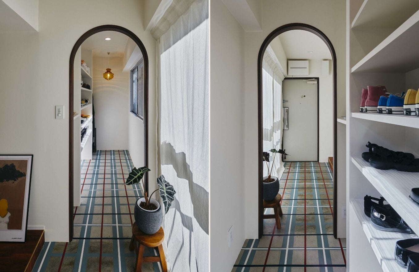基本的に玄関土間の床はモルタル仕上げが多いですが、施主様のご要望によりチェック柄をペイントしました。床にラインが入ることで、空間に奥行きが生まれ、より広く見えます。