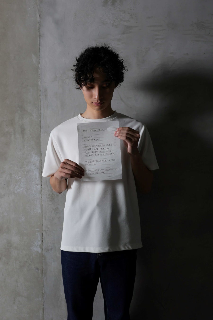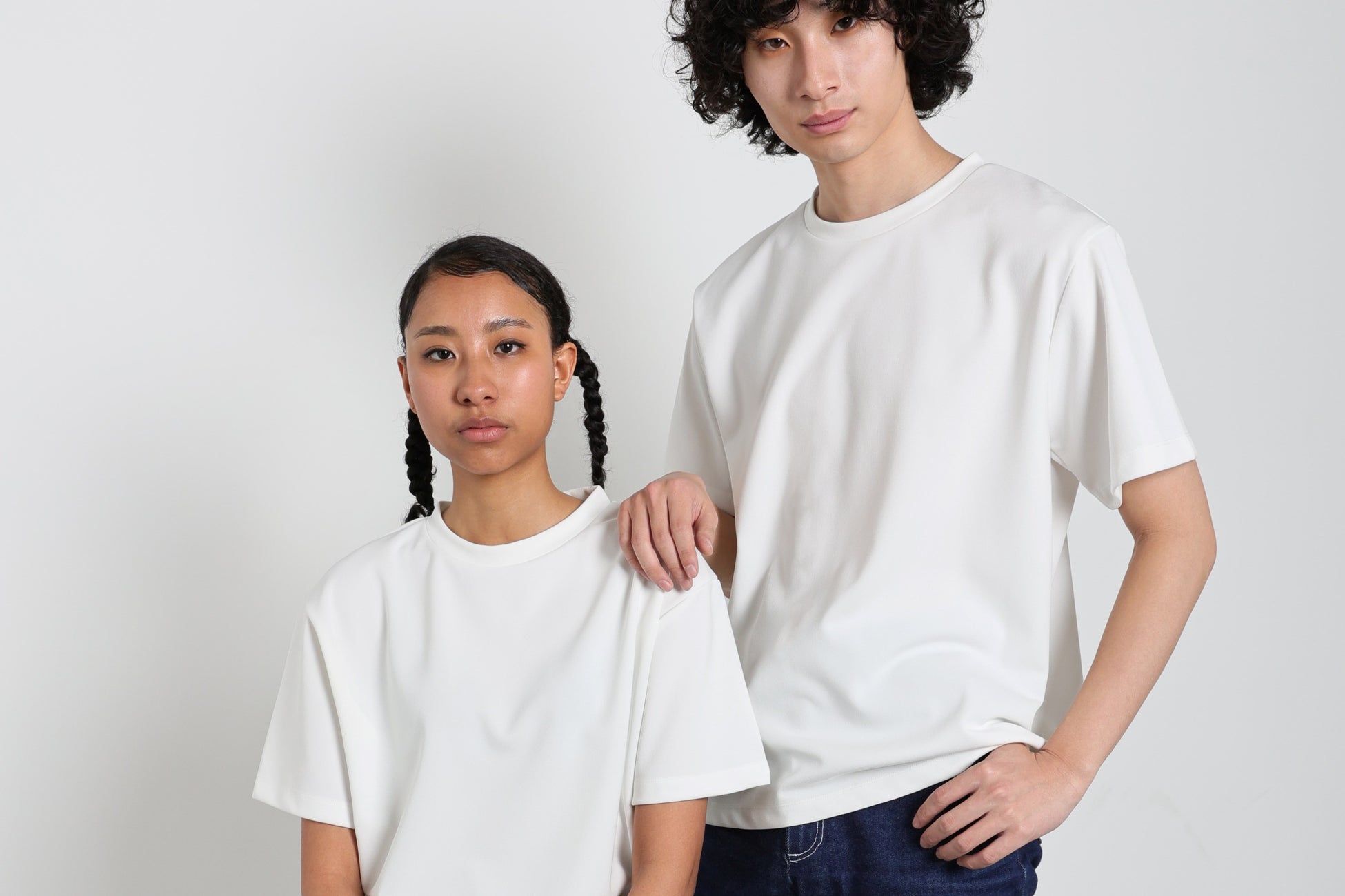 一般的なTシャツに使われる生地は約5オンスであるのに対し、約10オンスの贅沢な肉厚のニット生地を採用。しっかりとした厚さの生地のため1枚でも安心感があり、まるでジャケットを着た時のような着心地です。