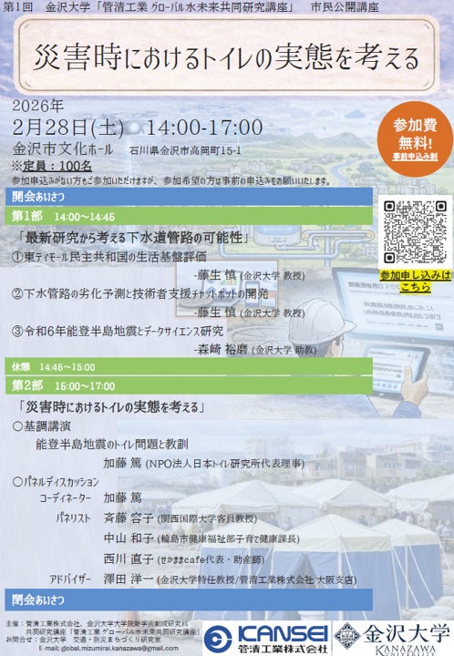 管清工業株式会社(本社:東京都世田谷区、代表取締役:長谷川健司、以下「管清工業」)は、2025年4月に金沢大学(所在地:石川県金沢市、大学長:和田隆志)との間で設置した共同研究講座において、このたび第1回市民公開講座「災害時におけるトイレの実態を考える」を開催することとなりましたのでお知らせいたします。