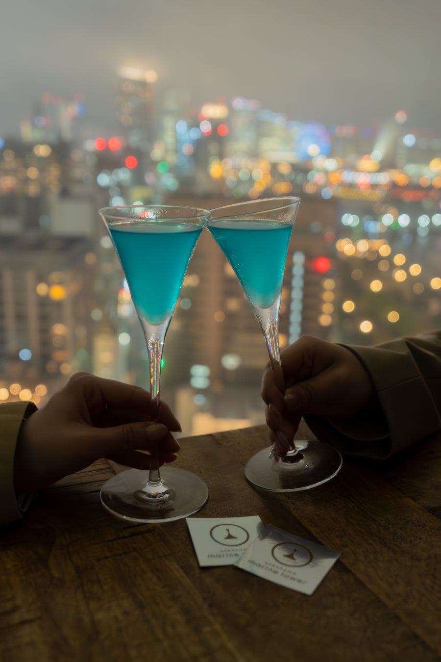 夜になると水町通り側1階に灯りがともり、ノスタルジーな雰囲気と共に特別なお酒を楽しむことのできるBar Noble MARINE TOWERより『 65周年オリジナルカクテル 』が登場いたします♪