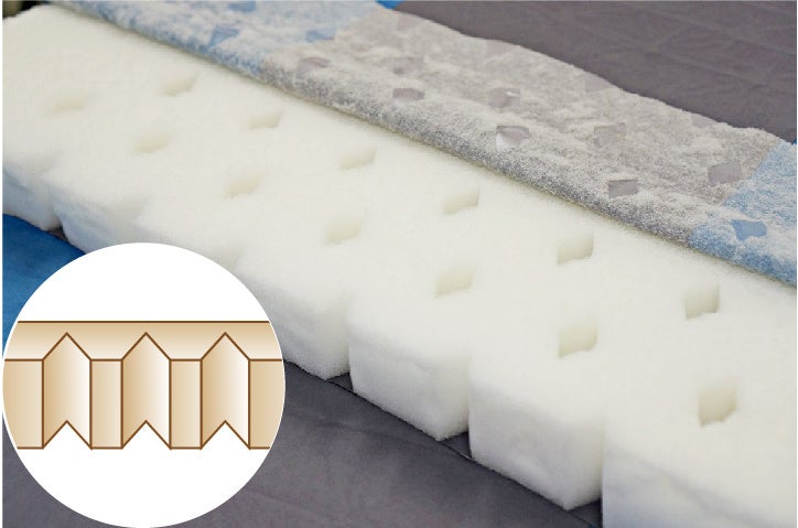 厚さ5cmのウレタンフォームを垂直にひし形に打ち抜いています。ウレタンの”面”ではなく”柱”と空気で支えるため弾力性に優れ、軽量化を保ちながら座り心地の良さを実現しています。