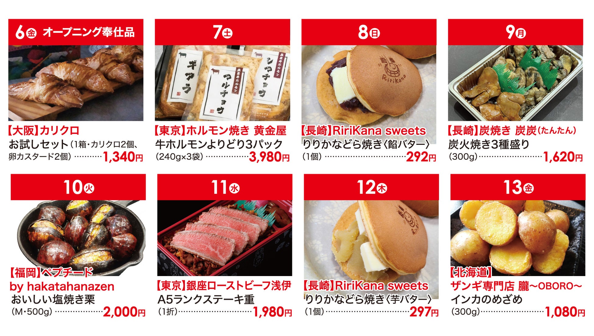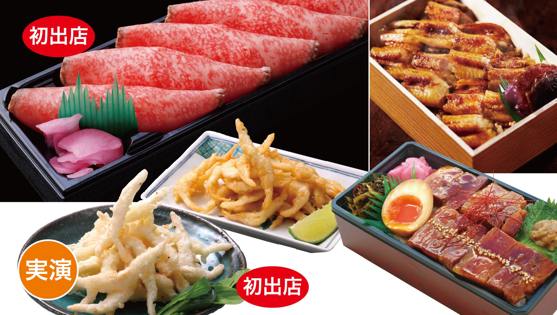 また、北は北海道から南は鹿児島まで、全国各地の名店が自慢の逸品をお届けします。高知の藁焼きかつおたたき、東京銀座のA5ランクローストビーフ、石川の白えび天ぷら、広島のあなご飯など、各地の食材を活かした「実演ずくし」で、日本全国の豊かな味覚をお楽しみいただけます。そして毎日変わる「数量限定日替り奉仕品」も見逃せません。