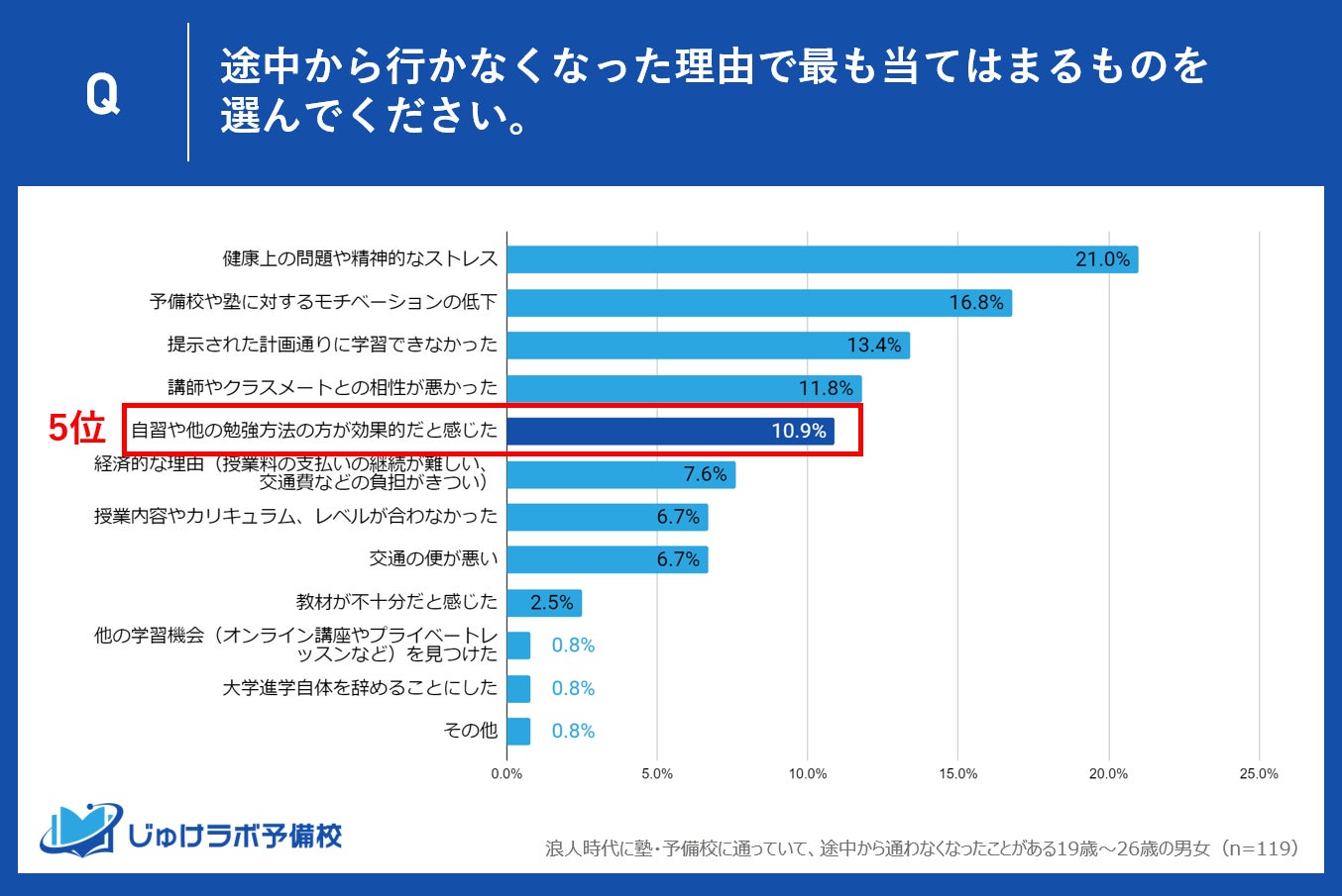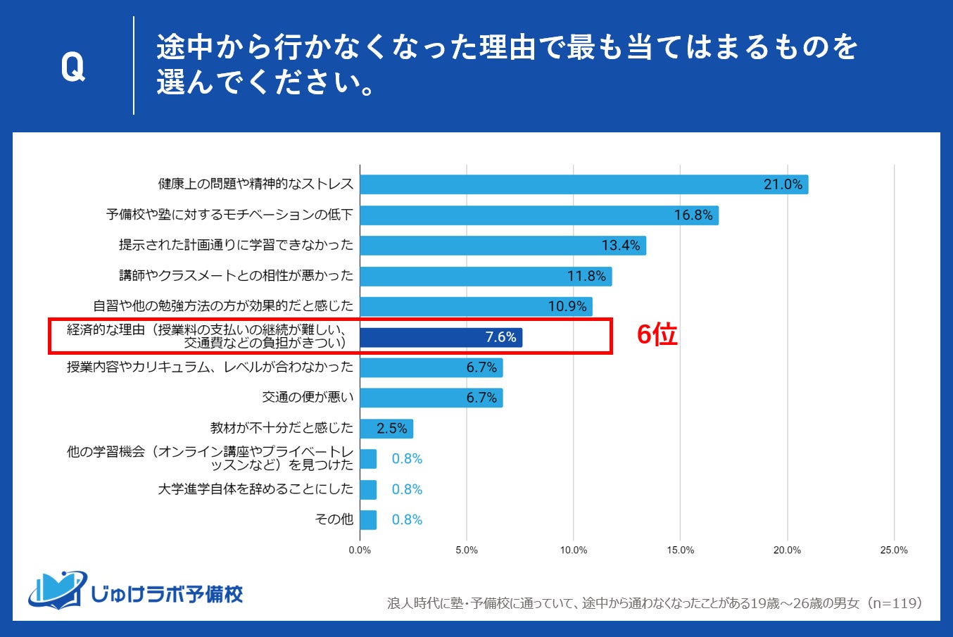 浪人生が塾や予備校を辞めたり行かなくなる理由はさまざまです。理由の7位としてあがったのが、「交通の便の悪さ」と「授業内容やカリキュラム、レベルが合わなかった」が共に6.7%でした。この結果から地理的な制約が学習機会に影響を及ぼしている一方で、塾や予備校が提供している学習カリキュラムや授業内容が全ての学生のニーズに応えていない現状も明らかになりました。