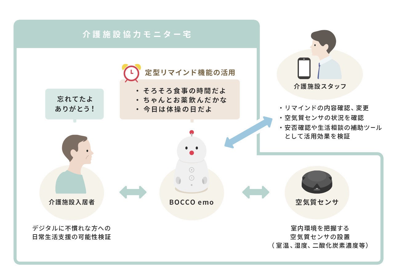 - 具体的には、10 名が入居する各居室にロボットとセンサーを設置し、居室内の環境をセンサーでモニタリングするとともに、ロボットから入居者に服薬や室温管理・換気、水分摂取などの声掛けを行う。また、居室の温度・湿度などを可視化し、スタッフが室内環境を把握できるようにする。