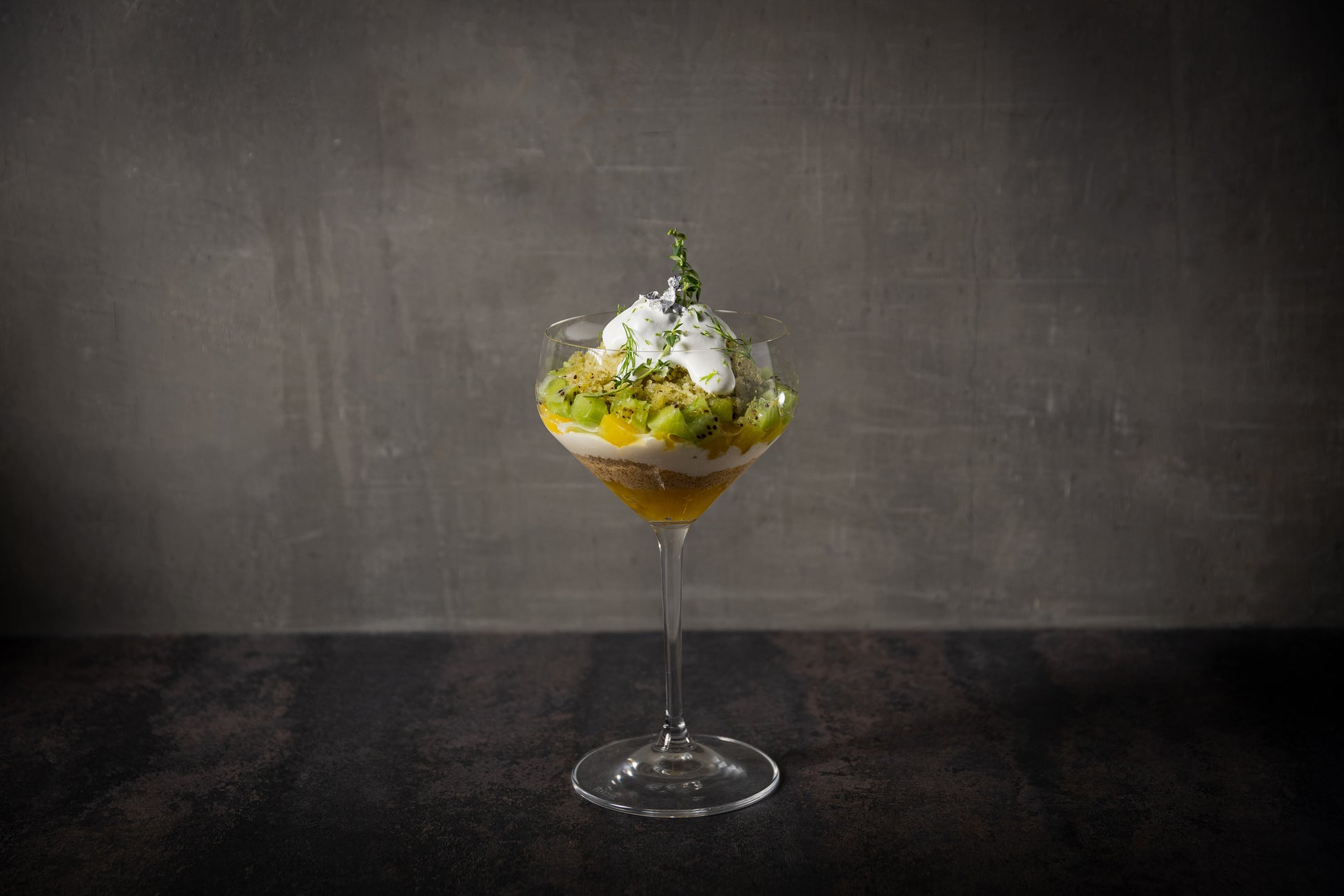 ボタニカルジンの香りを沖縄県産パイナップル「ゴールドバレル」をメインに、キウイとハーブにライムを加え、ココナッツムースを合わせて楽しむ夏を先取るパフェ。青く爽やかなキウイの酸味とジンの香りをお楽しみください。