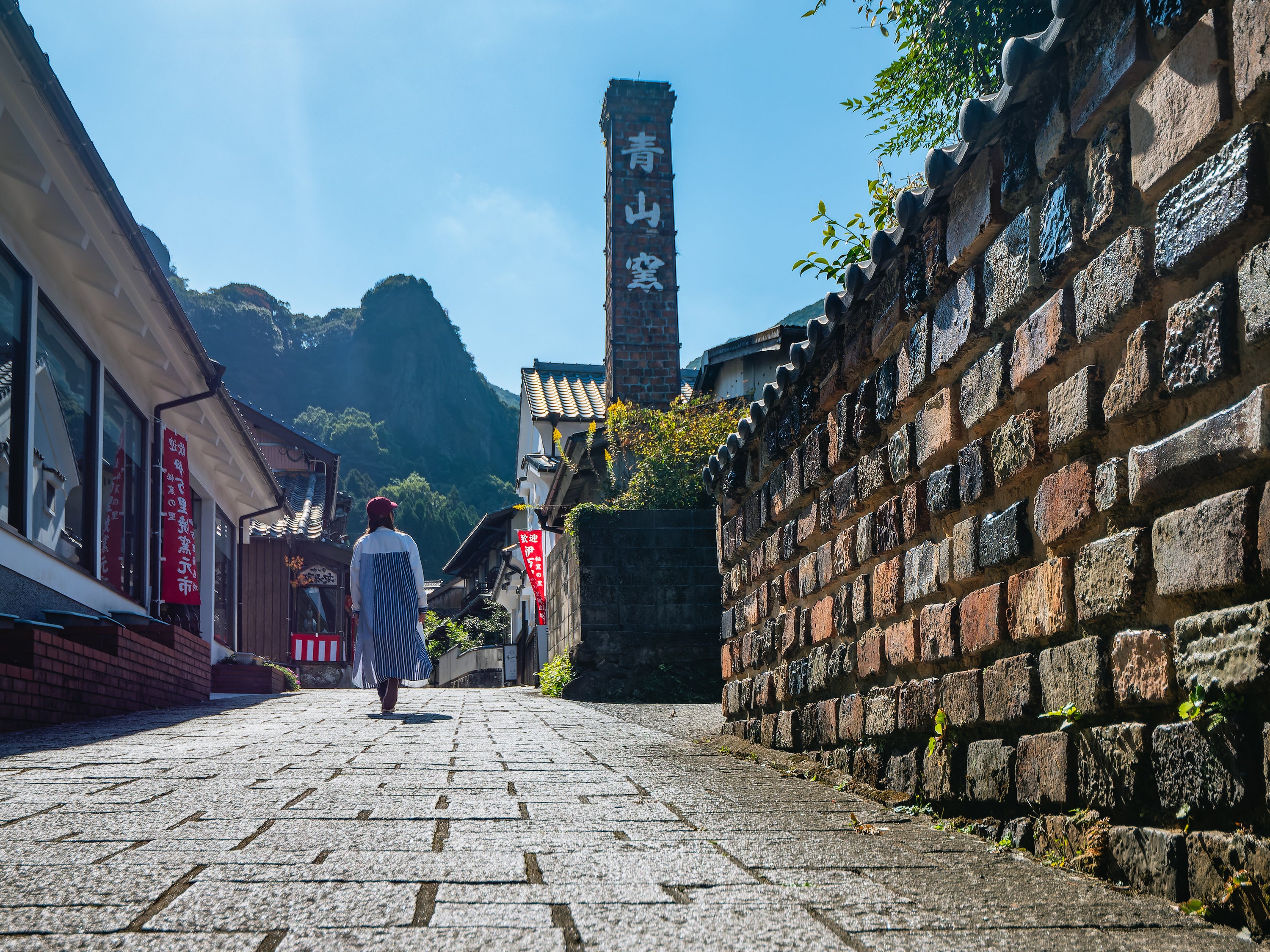 この大川内山には、製陶の秘法を守った関所、お経石窯や清原窯などの登り窯跡、陶工の家などが見事に再現されている「鍋島藩窯公園」があります。山道を進むと古窯跡など歴史的文化遺産とともに様々な磁器のオブジェがあり、静かな街並みと自然に調和しています。レンガ造りの煙突や窯元が立ち並び、350年の歴史と伝統を感じさせます。