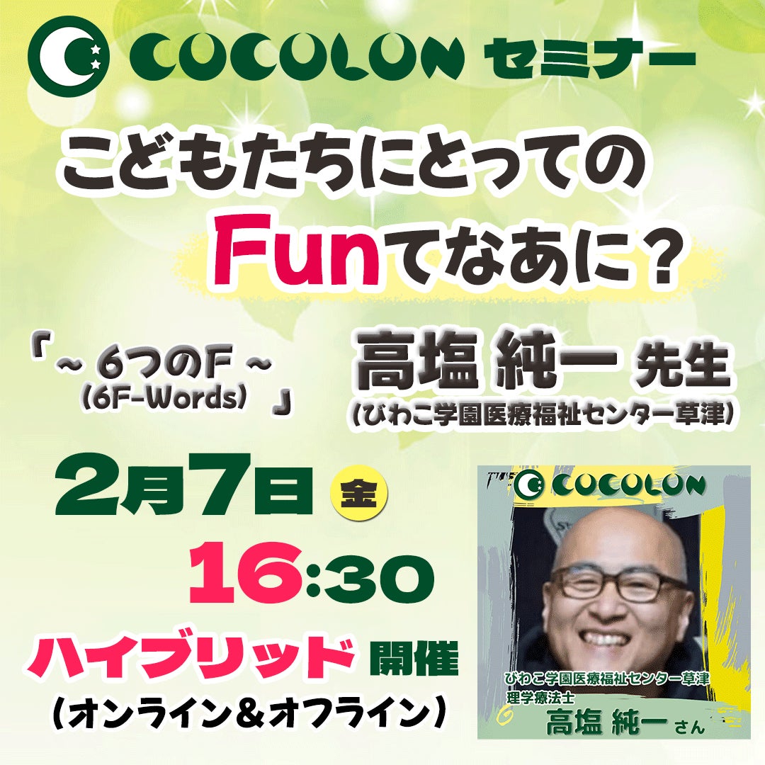 2月7日(金)はびわこ学園医療福祉センター草津の理学療法士である高塩純一氏を招き、セミナー「こどもたちにとってのFunてなあに?~6つのF~」を実施。
