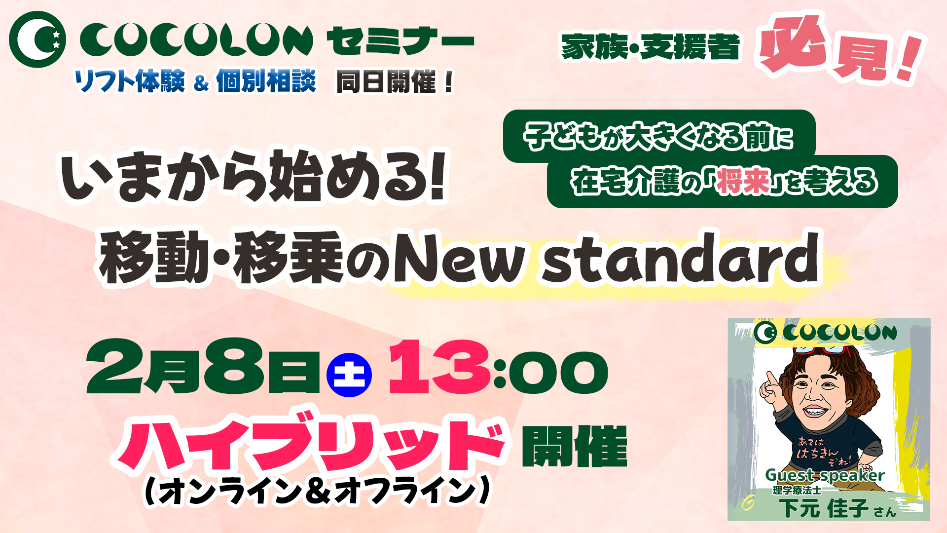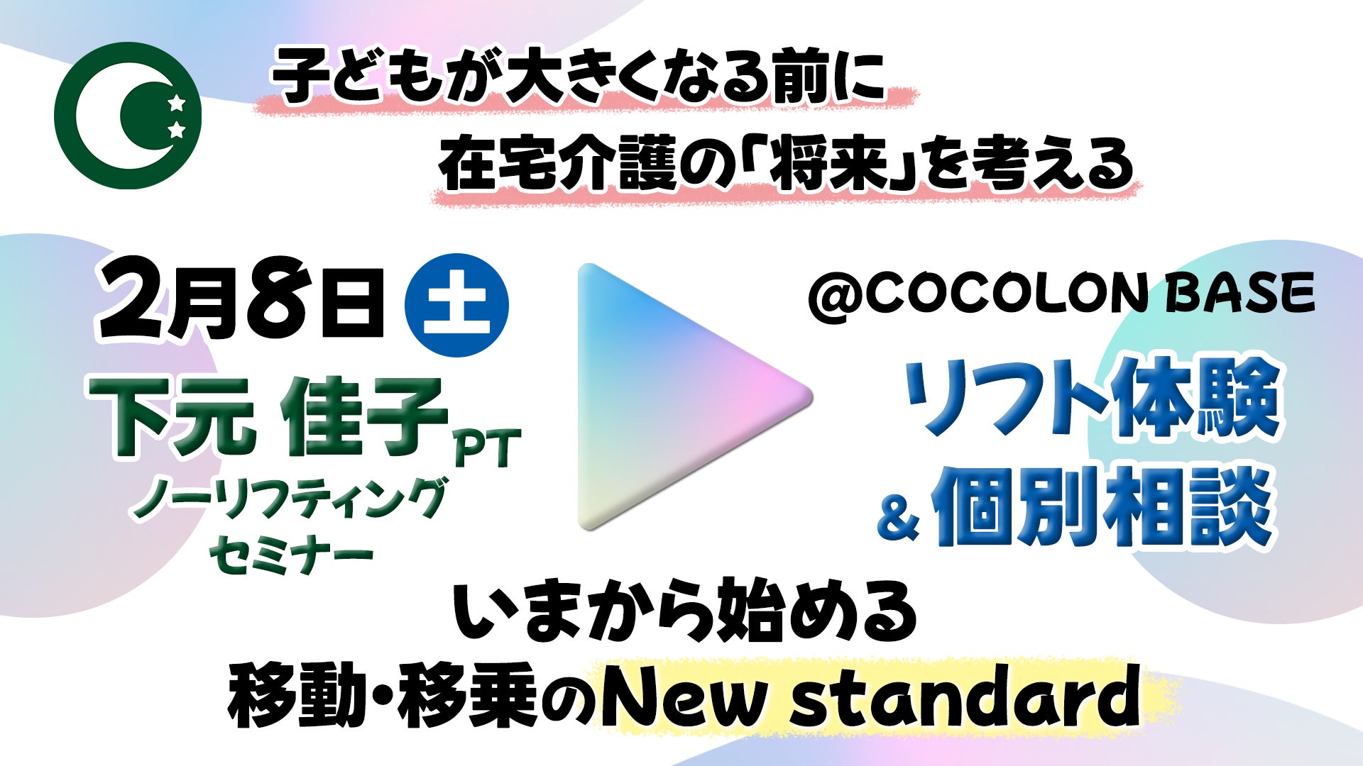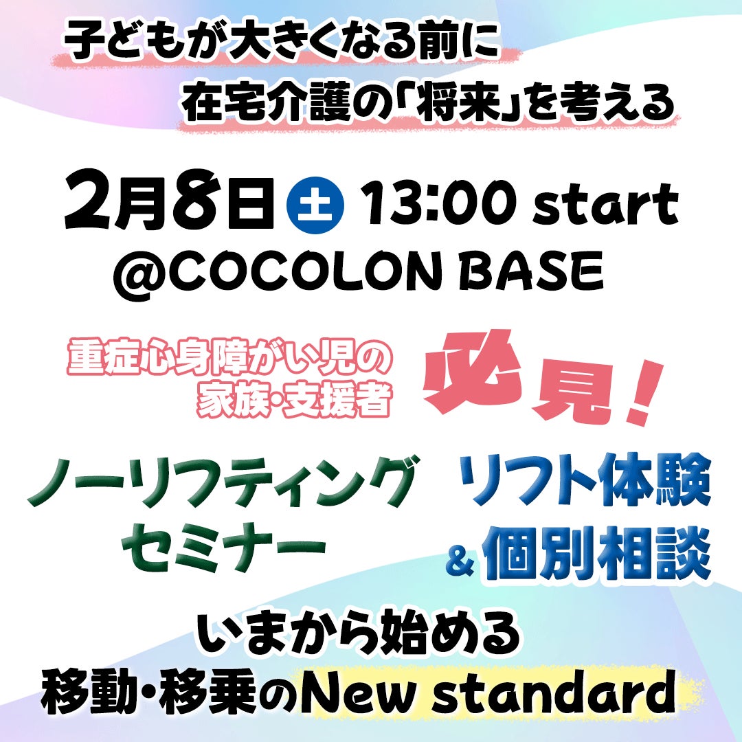 重症心身障がい児のと家族や支援者向けに学び・遊び・情報を提供する「COCOLON」(運営:特定非営利活動法人EPO、東京都江戸川区、代表:齋藤えりか)は、2025年2月7日(金)、8日(土)にCOCOLON BASEで「COCOLONまなびdays」を開催します。2日目の2月8日(土)は理学療法士の下元佳子氏(一般社団法人ナチュラルハートフルケアネットワーク、代表理事)を招き、ノーリフティングケアのセミナーと「介護用リフトの試乗・相談ができるmini機器展」を開催します。