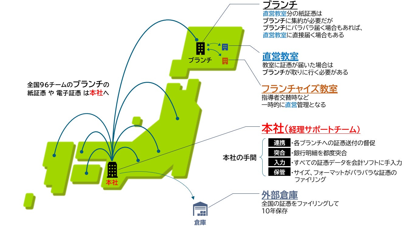 日本国内で展開する約100教室の本社直営の教室の公共料金をブランチが支払いを行い、ブランチが請求書や支払証明書等の証憑を本社経理サポートチームに送付する体制であった。また、本社経理サポートチームは受け取った証憑をもとに、各教室別に会計システムに入力し、紙の証憑はファイリングして10年間保管する業務を運用していた。