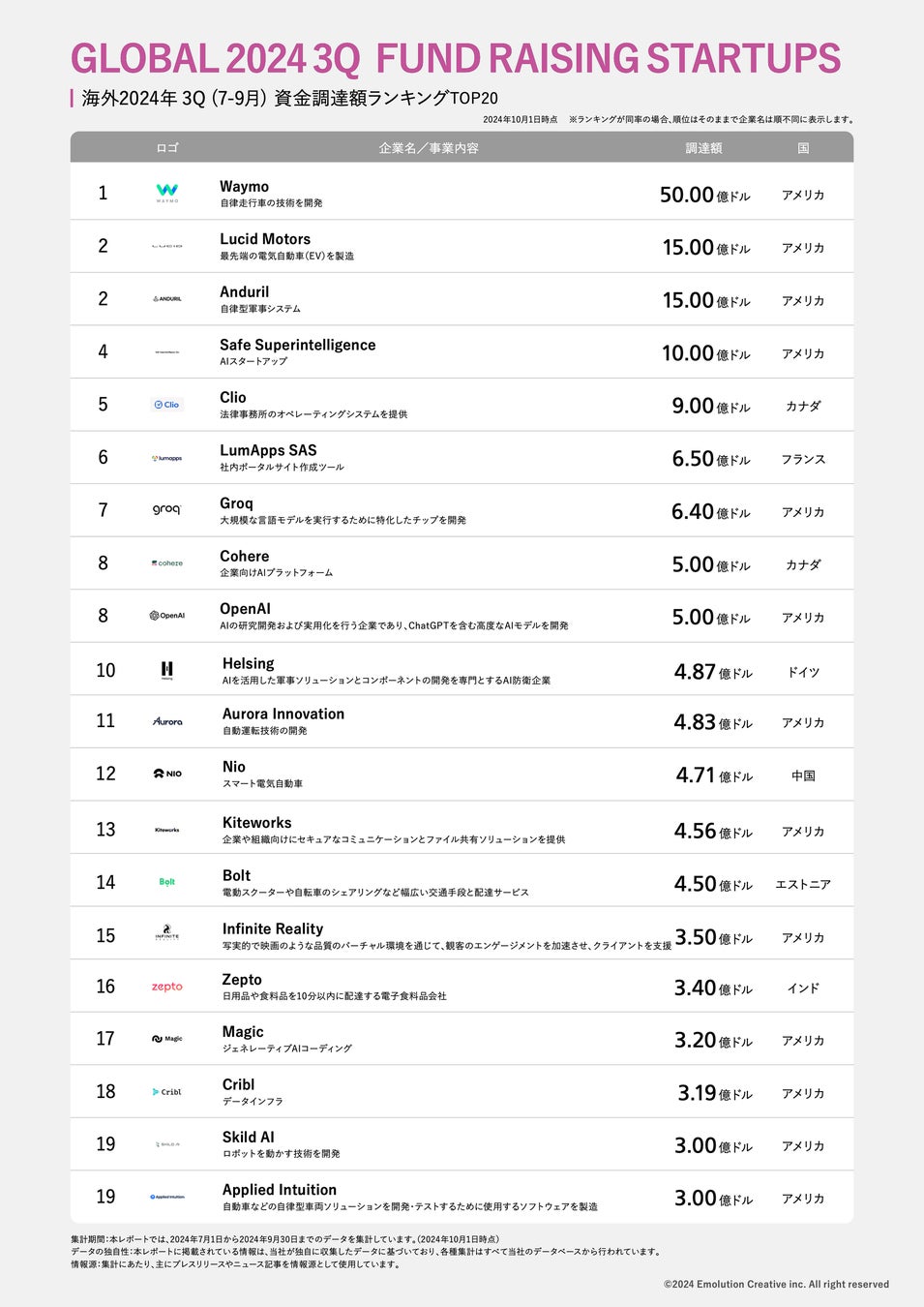 国内最大級のスタートアップメディア「Uniqorns(ユニコーンズ)」を運営する株式会社EmolutionCreativeが、2024年第3四半期(7月〜9月)の海外スタートアップ資金調達状況をランキング形式で発表しました。このレポートは、EmolutionCreativeが独自に収集したデータに基づいており、スタートアップの生態系の進化に貢献することを目的としています。