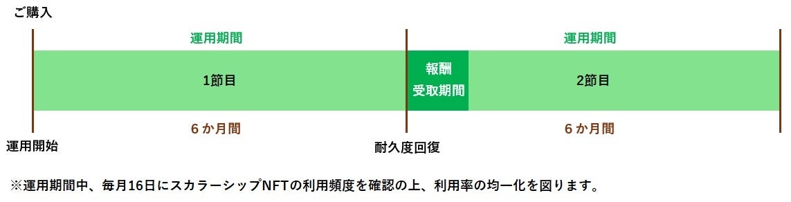耐久度が無くなった装備は、自動的に修理されてすぐに2節目の自動運用が再開されますが、同時に2節目の自動運用再開から1か月間、スカラーシップNFT(ボンド)と事業収益を引き換えることが出来る事業収益の受取期間が始まります。