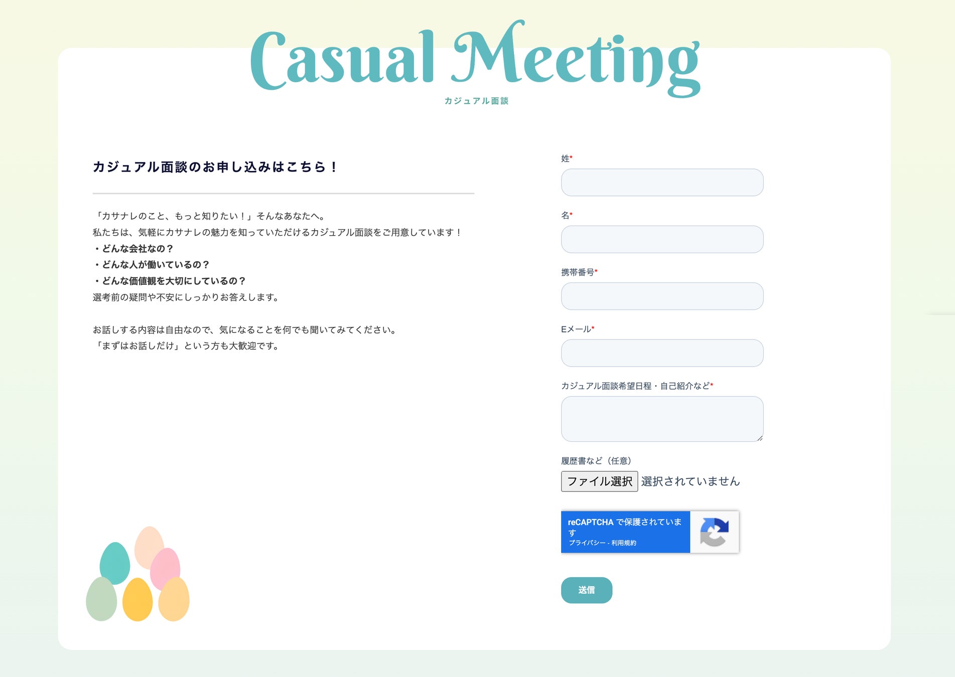 「会社の雰囲気を知りたい」「まずは話を聞いてみたい」という方向けに、カジュアル面談を実施しています。採用ページから気軽にお申し込みいただけるフォームを設置し、選考前の疑問や不安を解消する機会を提供しています。