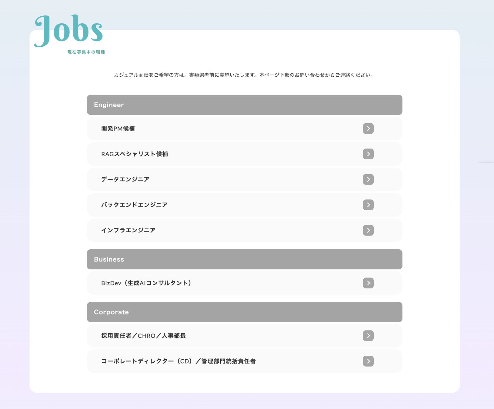 部門ごとに最新の募集情報を確認できるため、自分に合ったポジションを見つけやすい設計となっています。