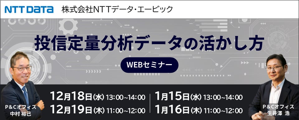 株式会社NTTデータ・エービック(本社:東京都港区、代表取締役社長 大谷 温仁、以下「当社」)は、12月と1月に「投信定量分析データの活かし方」WEBセミナーを開催します。