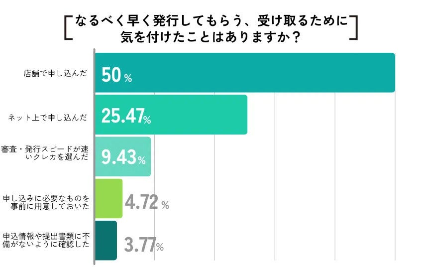 なるべく早く発行・受け取りするために「店舗で申し込んだ」と答えている人が半数。