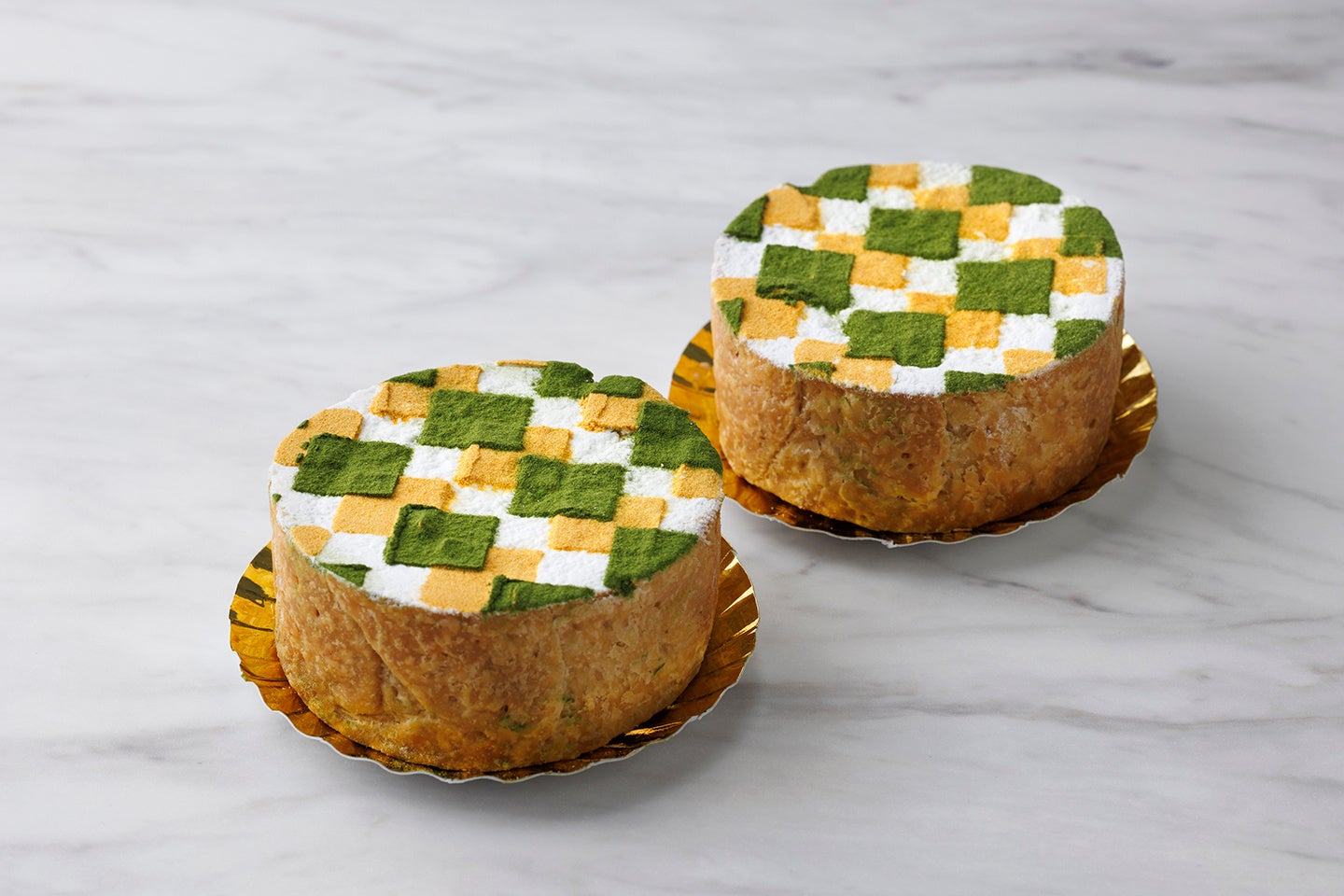 *寄木パイ ¥900(税込) 健康志向を意識した野菜ベースのパイ。南瓜のペーストに人参やほうれん草を混ぜ込み、野菜の甘みを活かしたあっさりとしたフィリングに。焼き上げたパイの表面にはほうれん草と人参のパウダーで寄木細工を表現。パウダーの色がより一層映えるようにパウダーの下には砂糖不使用の生クリームを使用しているのもポイントです。 *雪解けクロワッサン ¥300(税込) 箱根大文字山(明星ヶ岳)の雪解けをイメージしたパン。チョコレートを混ぜ込んだクロワッサン生地で山肌を、抹茶味のクッキー生地で山の緑を表現。そして焼き上げたクロワッサンにはホワイトチョコレートと粉糖をトッピングし箱根大文字山(明星ヶ岳)に降った雪をイメージしました。 |