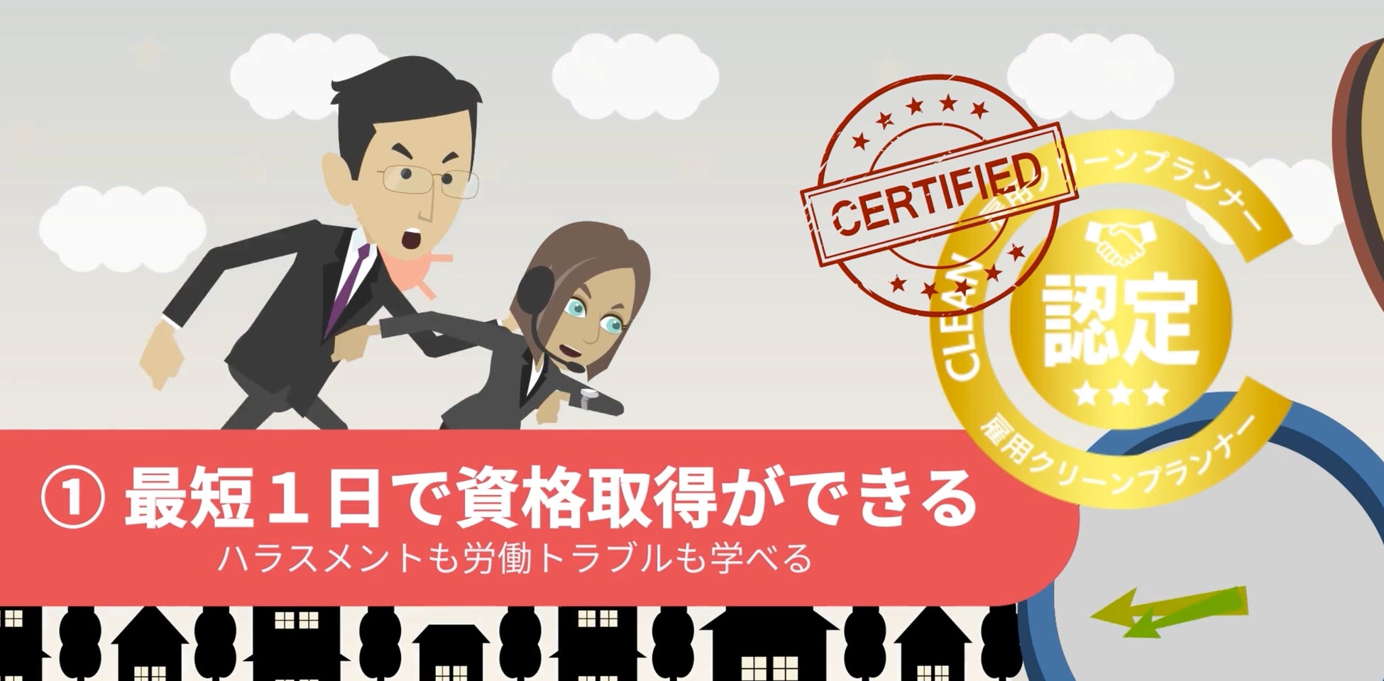 【ハラスメントをゼロにする】をミッションに掲げ、働きやすい社会を創るための「雇用クリーン」事業を行っています。国策推進の注⽬資格『雇用クリーンプランナー』は、国策推進の注⽬資格「雇⽤クリーンプランナー」は、ハラスメント社会を⽣き抜くための正しい知識とリテラシーを⾝につけることができ、厚労省が主幹する⼈材開発⽀援助成⾦の対象となっている資格です。『雇⽤クリーン企業認定』は、クレア⼈財育英協会が実施している雇⽤クリーンプランナー在籍企業に対して付与・認定する事業です。雇⽤クリーンプランナーが在籍する企業には「雇⽤クリーン企業認定」を付与されるため、社員の雇⽤環境意識が⾼く社員が働きやすいことの証明、就職希望者との採⽤ミスマッチ、⼈材採⽤等にも積極的に活⽤いただいております。