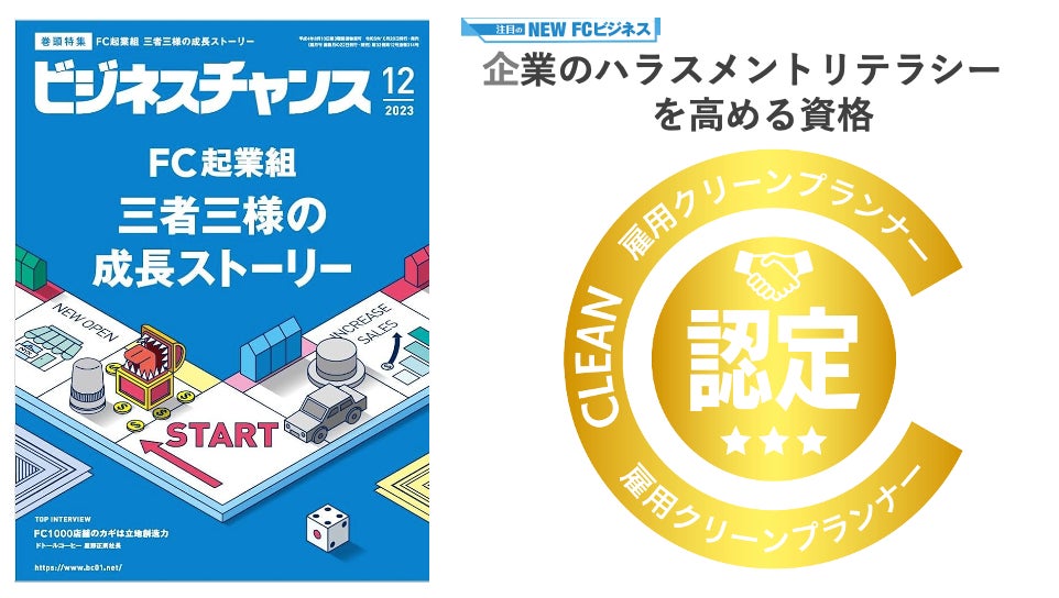 一般社団法人クレア人財育英協会(代表理事:酒井 康博 東京都千代田区紀尾井町3-12 紀尾井町ビル6階)は、フランチャイズ(FC)業界唯一の専門情報誌ビジネスチャンスで「注目のNEW FCビジネス」として弊社代表の酒井がインタビューを受けました。本取材の中で、「雇用クリーンプランナー」(旧称:労働トラブル相談士)の受講者数が500名を突破したことを発表しました。