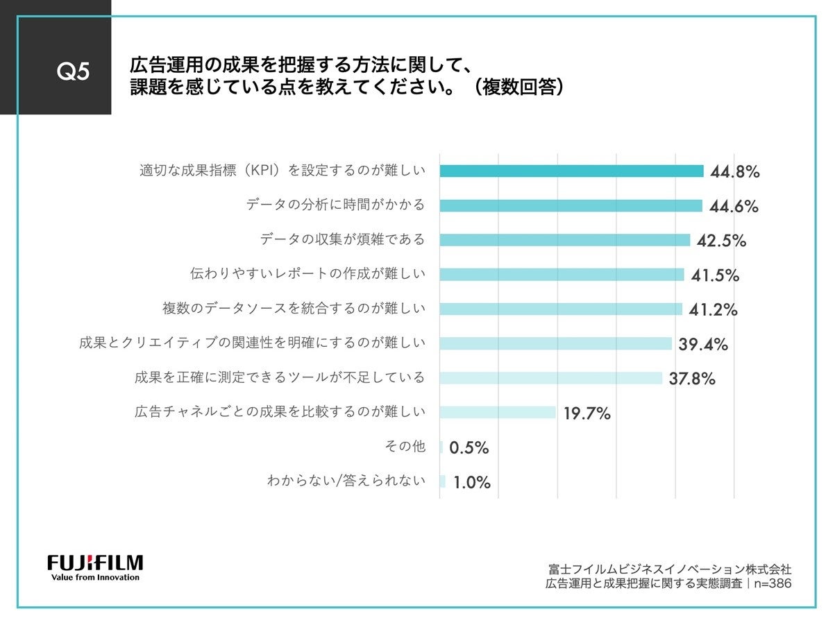 Q4で「非常に感じている」「やや感じている」と回答した方に、「Q5.広告運用の成果を把握する方法に関して、課題を感じている点を教えてください。(複数回答)」(n=386)と質問したところ、「適切な成果指標(KPI)を設定するのが難しい」が44.8%、「データの分析に時間がかかる」が44.6%、「データの収集が煩雑である」が42.5%という回答となりました。